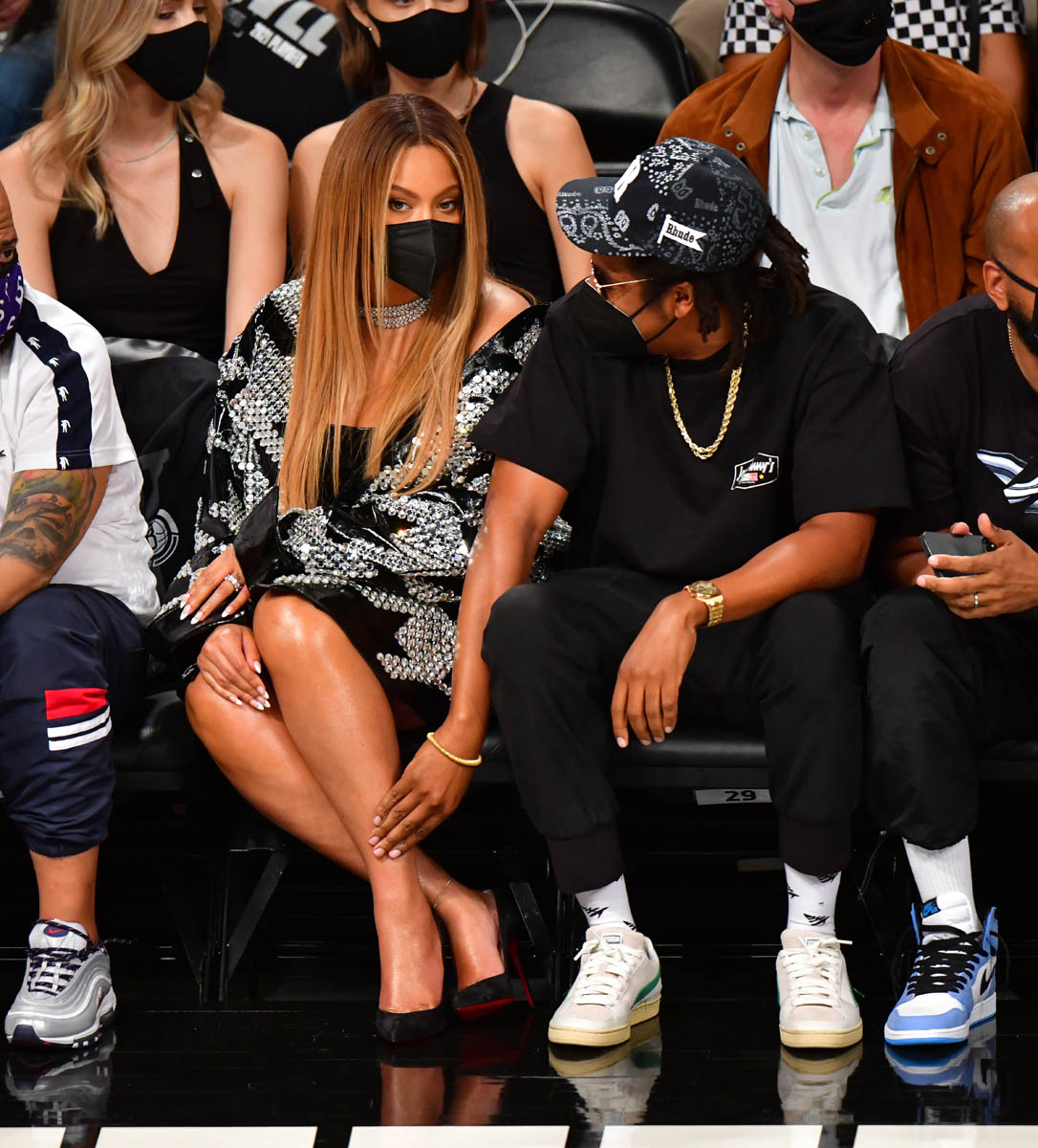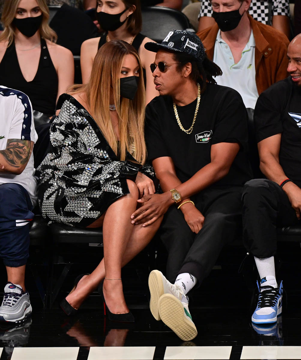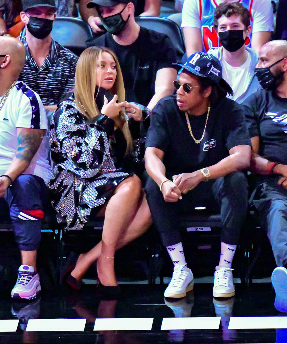 Beyoncé and Jay-Z were in New York this weekend to watch the Brooklyn Nets and the Milwaukee Bucks. As you can see, Beyoncé came to serve looks. This jacket is beyond, I want it so bad. But also, they came with the vibes. Like for each other. To some, the Carters read super close, with Beyoncé leaning in towards Jay and the handholding and the eye contact and the whispering and it’s cute. Although a part of me wonders too if she was also not feeling the dude sitting next to her which is why her body language is so closed to that person. Not that it matters – the point is, the Carters are tight, they’re quite obviously on a date night, having had dinner and hit up a party that night too. And B was definitely feeling it, as she posted on IG, mainly to show off herself in her outfit, as she should, but there’s a shot of Jay in the carousel too, and she chose one of her kissing him: