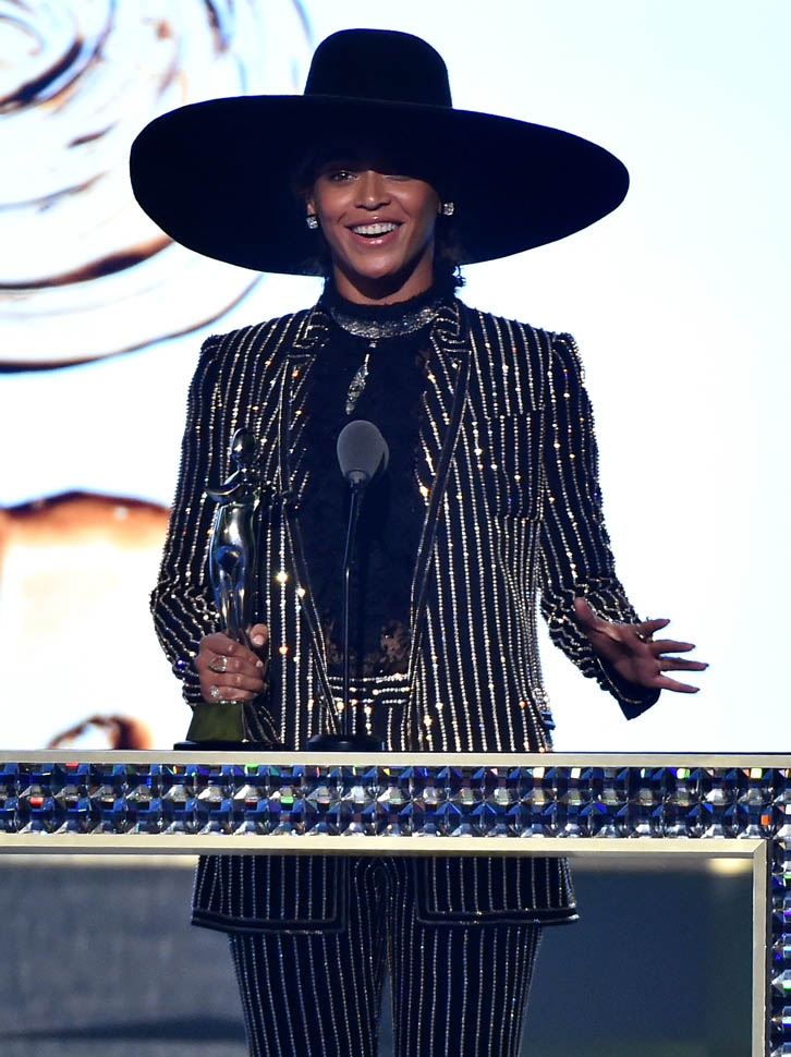 Last night Beyoncé received the 2016 CFDA Fashion Icon Award in New York. It was a surprise appearance. They did not publicise it beforehand, likely at her request. Because…well… because Beyoncé. Her mother was there. Jay Z was there. The Blue Ivy Carter was there (more on the BIC later). She wore Givenchy and I love LOVE this suit so much. She also wore a wide hat, not unlike that hat she wears to open the show in Formation on her tour. And that can’t have been an accident. Her remarks as she accepted her award were intended and intentional. Her remarks were also consistent with the messages of Lemonade – clothes as a threading link between the women in her family, the love embedded in those garments at once her inspiration, her protection, and her redemption. Beyoncé paid tribute to her grandmother, her mother, her uncle, the family unit that dressed her and, therefore, helped to build her image and identity – an experience she shares, in Lemonade, and in this speech, with black women for whom she’s become a beacon. Which is why she also, as she does in Lemonade, take the opportunity to advocate for those who do not have the right skin colour or body shape to wear couture, a metaphor here for acceptance. It’s not subtle either: