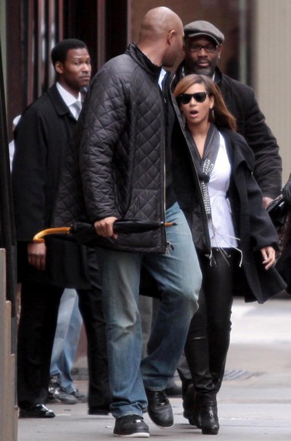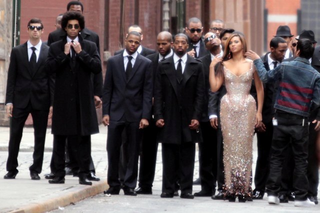 Check out Beyonce in New York on Sunday shooting a new video in a bedazzled gown. The top is lovely. The bottom…wonky and boxy, right? Terrible for the hips. Now if she were to show some leg, balance it out, probably would be slightly improved. As it is… not sweet, even with her 2 x Spanx. Kiu, be honest – you know I’m right.