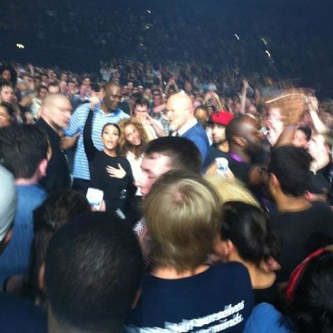 Kanye’s girlfriend is not capable of spontaneity. But look at B throw herself into the mass. (That blonde woman sort of kind of looks like Gwyneth Paltrow but is probably not.)