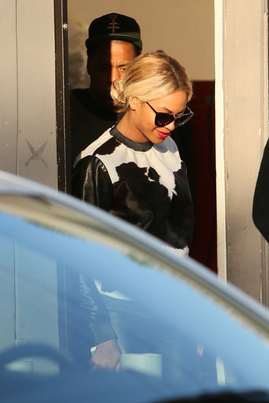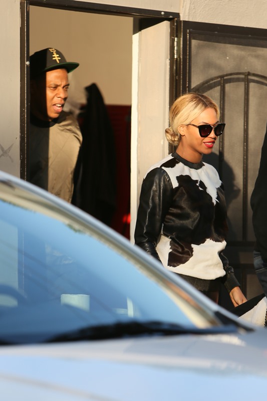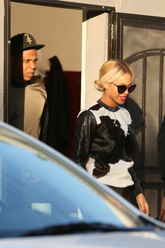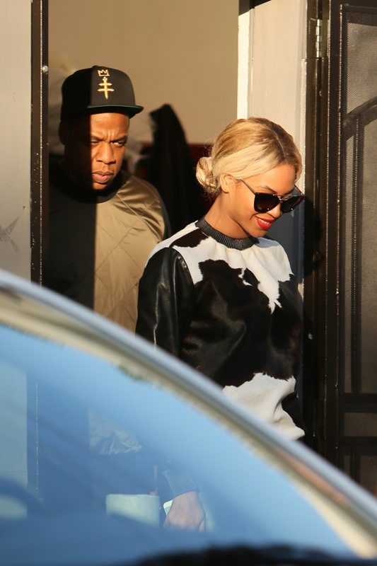 So Jay-Z announced that he's only eating plants for 22 days. Underneath his letter, there was a PS – B’s joining him too. And she’s dressing accordingly. In fur, pepperoni print clothing, and now this cow print sweater that omg I really want.