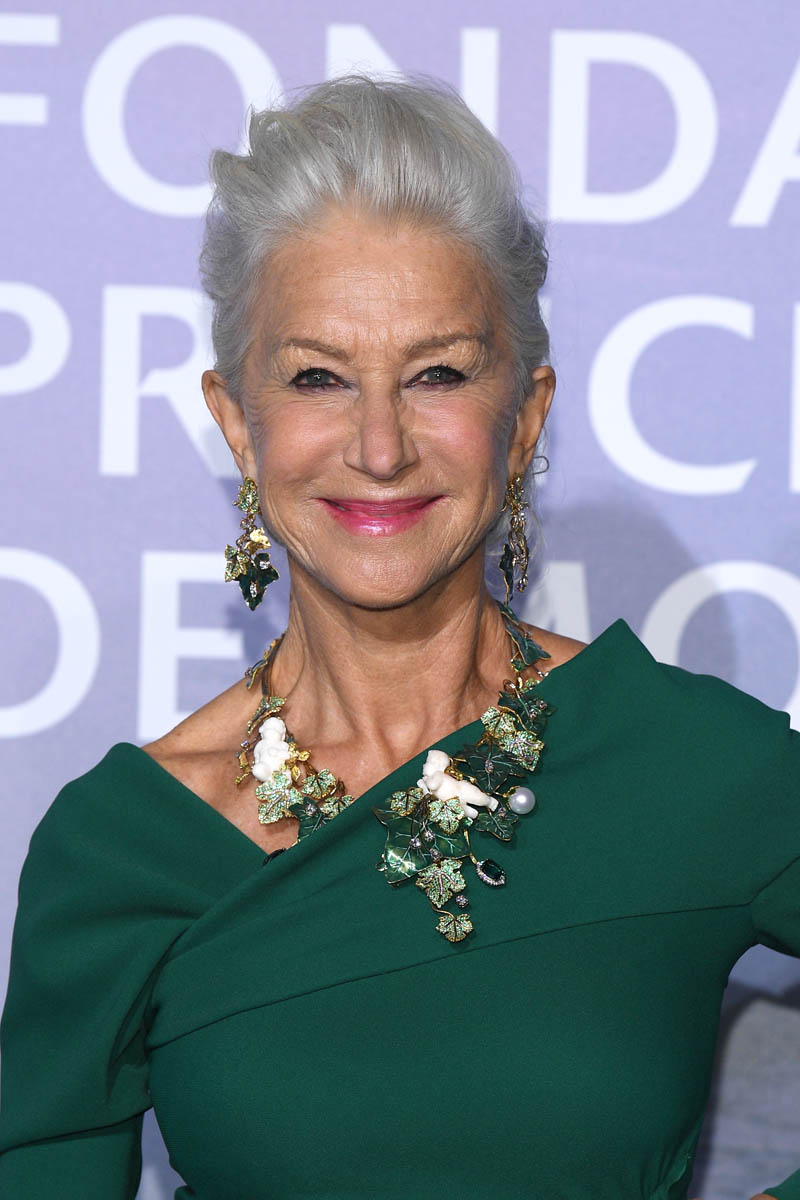 Helen Mirren in this green dress with the complementary jewels and the hair swept up and the matching mask, WOW. Am I reacting like this because it’s been such a drought? Because she is POPPING.