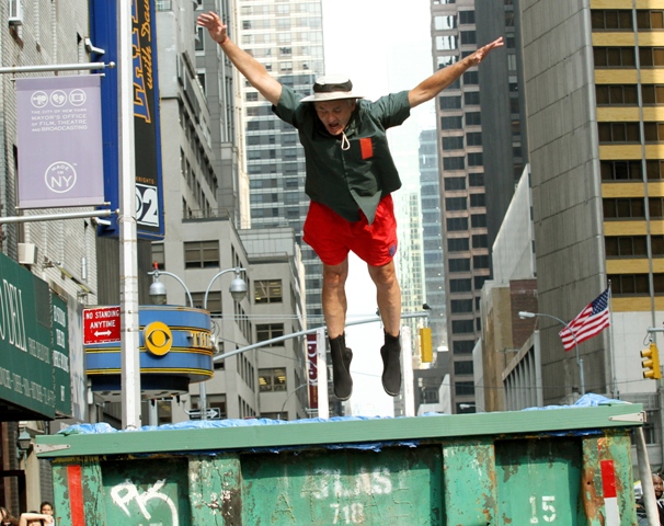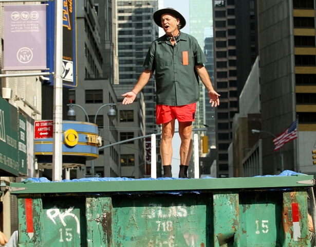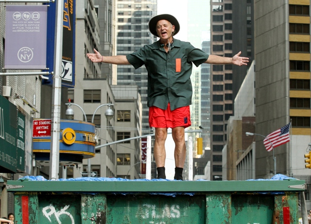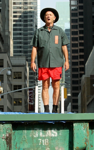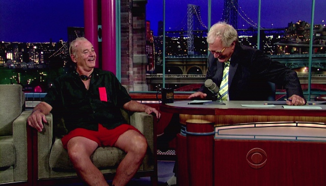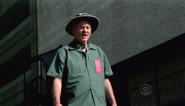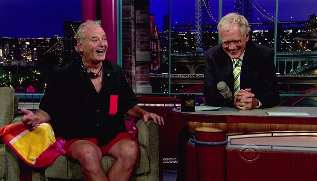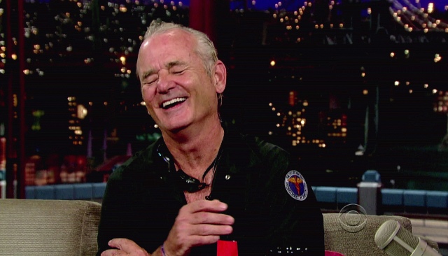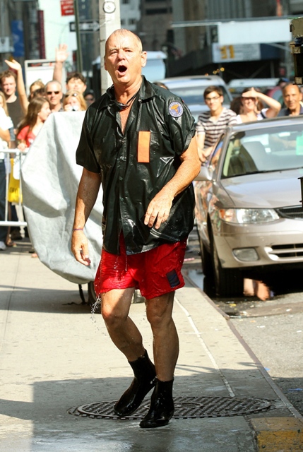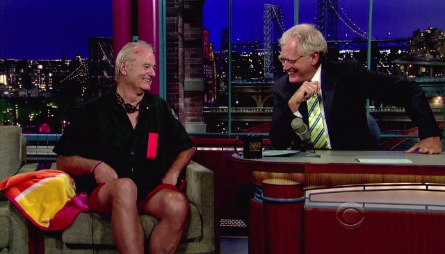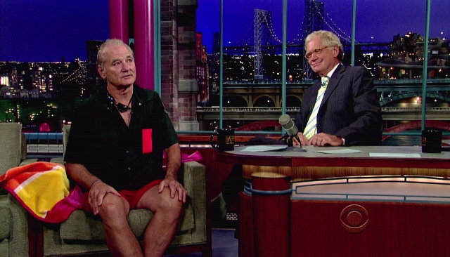 This is what Bill Murray did on Letterman last night. That’s another thing about Letterman over Leno. Cool people prefer Letterman. Bill Murray definitely prefers Letterman. Bill Murray would probably dive into a dumpster for reals before giving Leno any more love than necessary. And Bill went back to Letterman last night to promote Get Low and to also test out Dave’s new dumpster pool. The goggles. It’s all in the details, right?