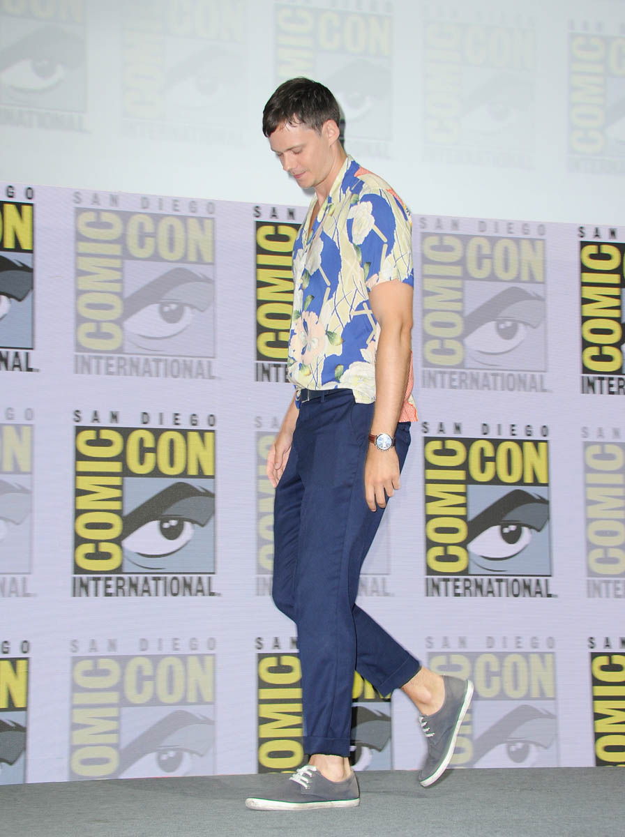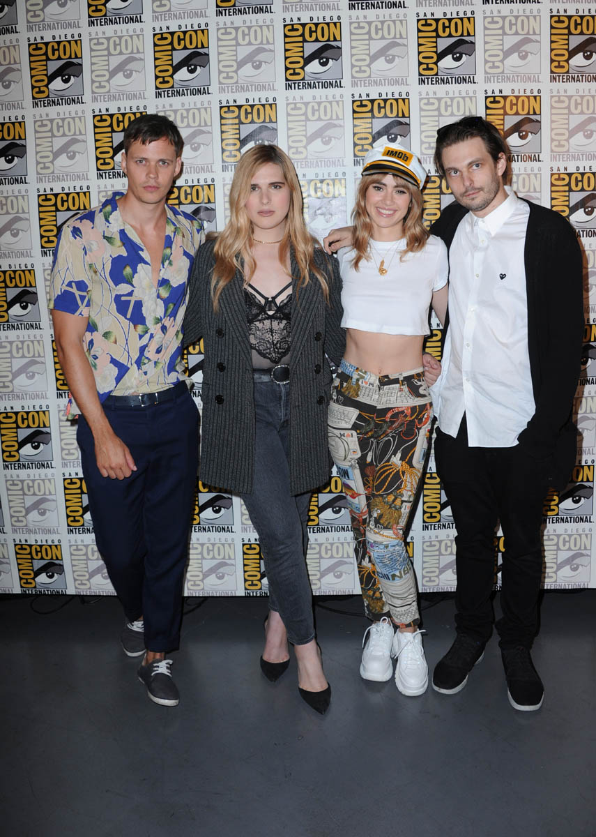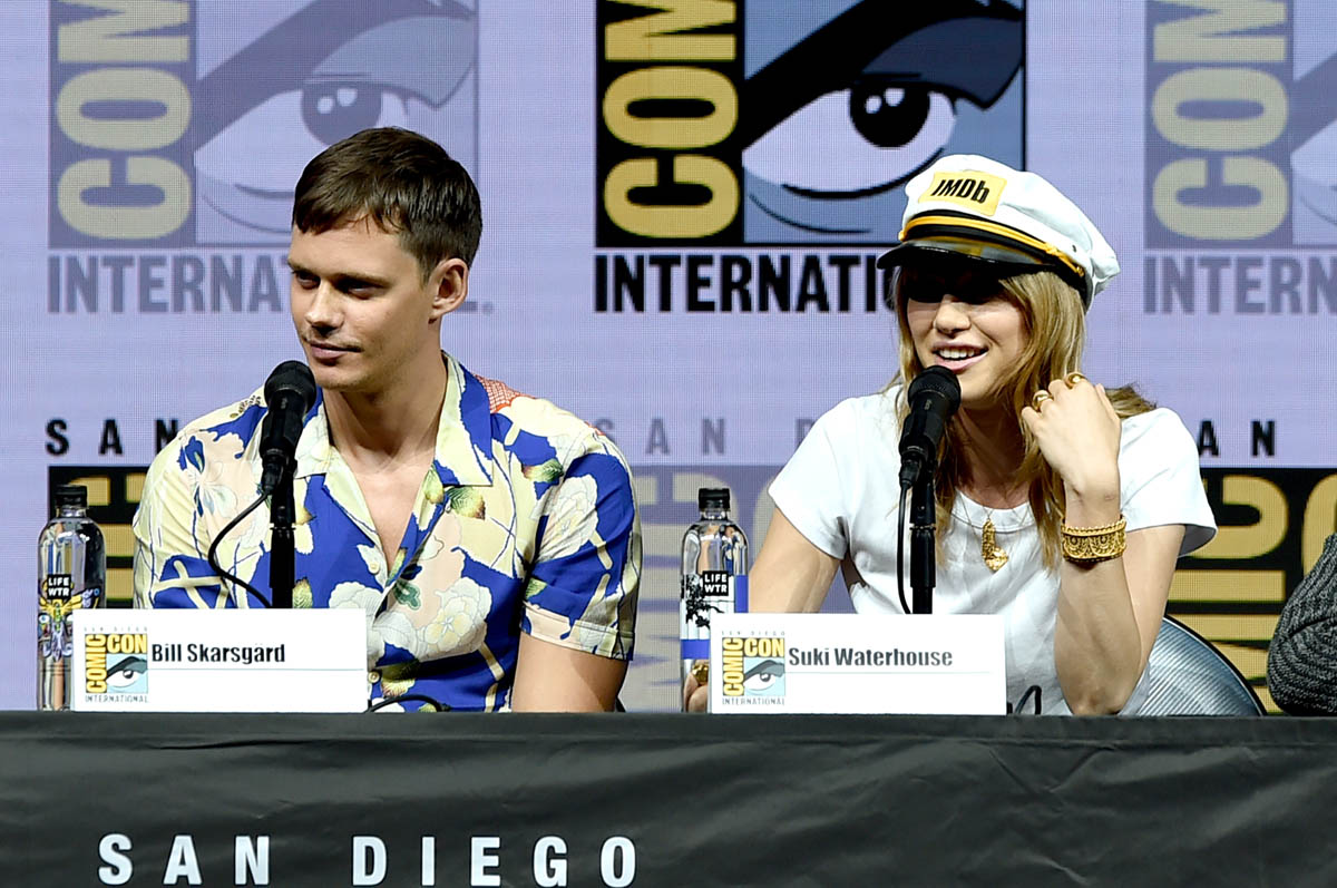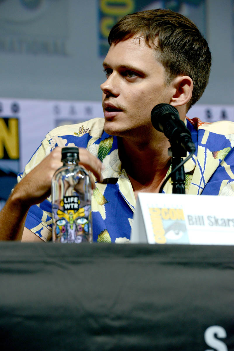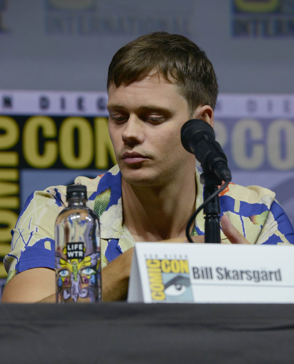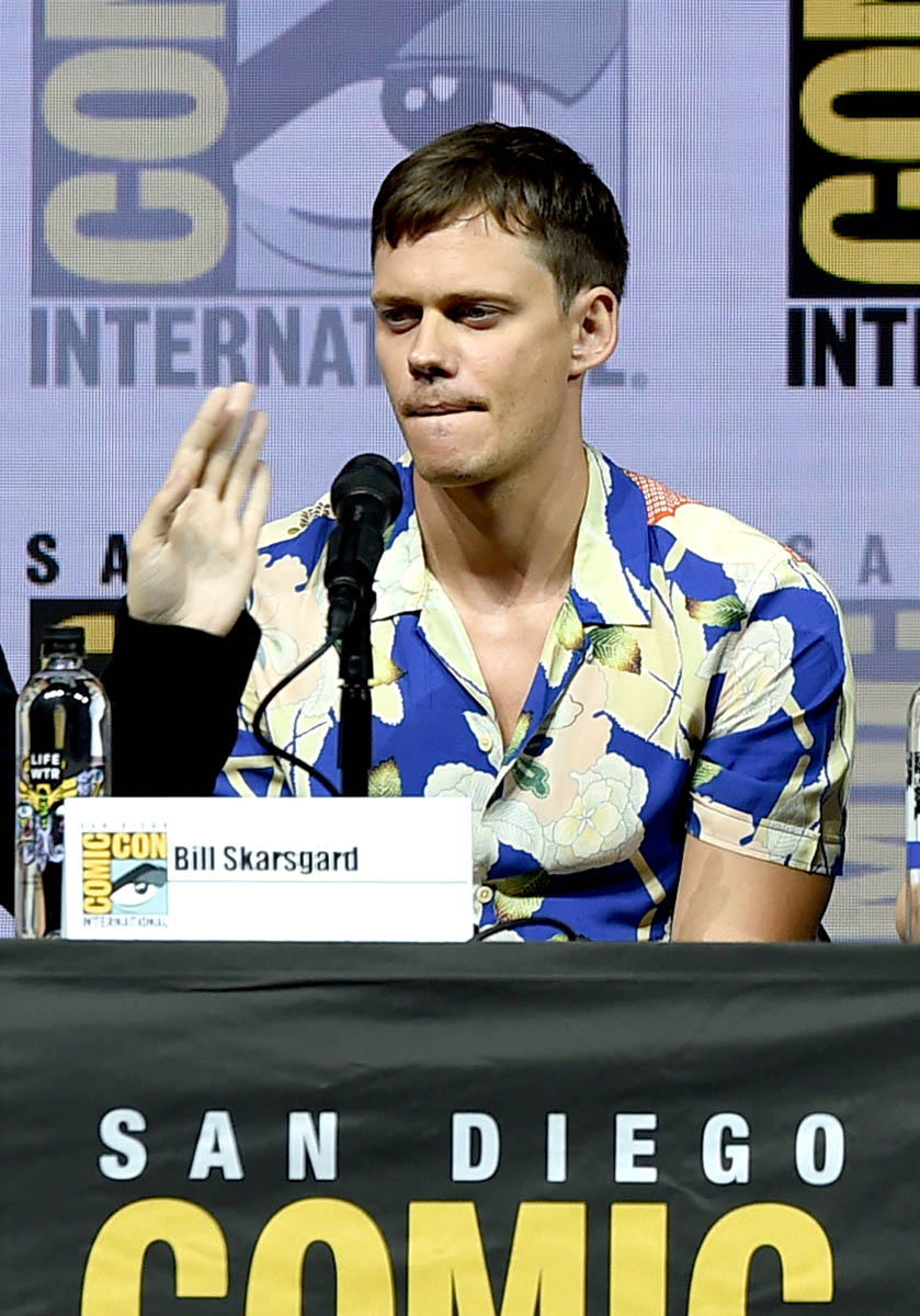 Bill Skarsgard, aka Hot Pennywise, brought his particular brand of creepy-hot to Comic-Con yesterday to promote Assassination Nation. Here he is, tall and handsome, not dressed like a murdering demon clown, with those ludicrous cheekbones everywhere. Are you into Bill Skarsgard? I am 100% on board. He’s my favorite Skarsgard brother. Have we ranked them? We’ve sorted the Hemsworths (Greater, Lesser, the other one), but have we sorted the Skarsgards? I would put Bill #1 but I know a lot of you go for Alexander. We need to take a vote.