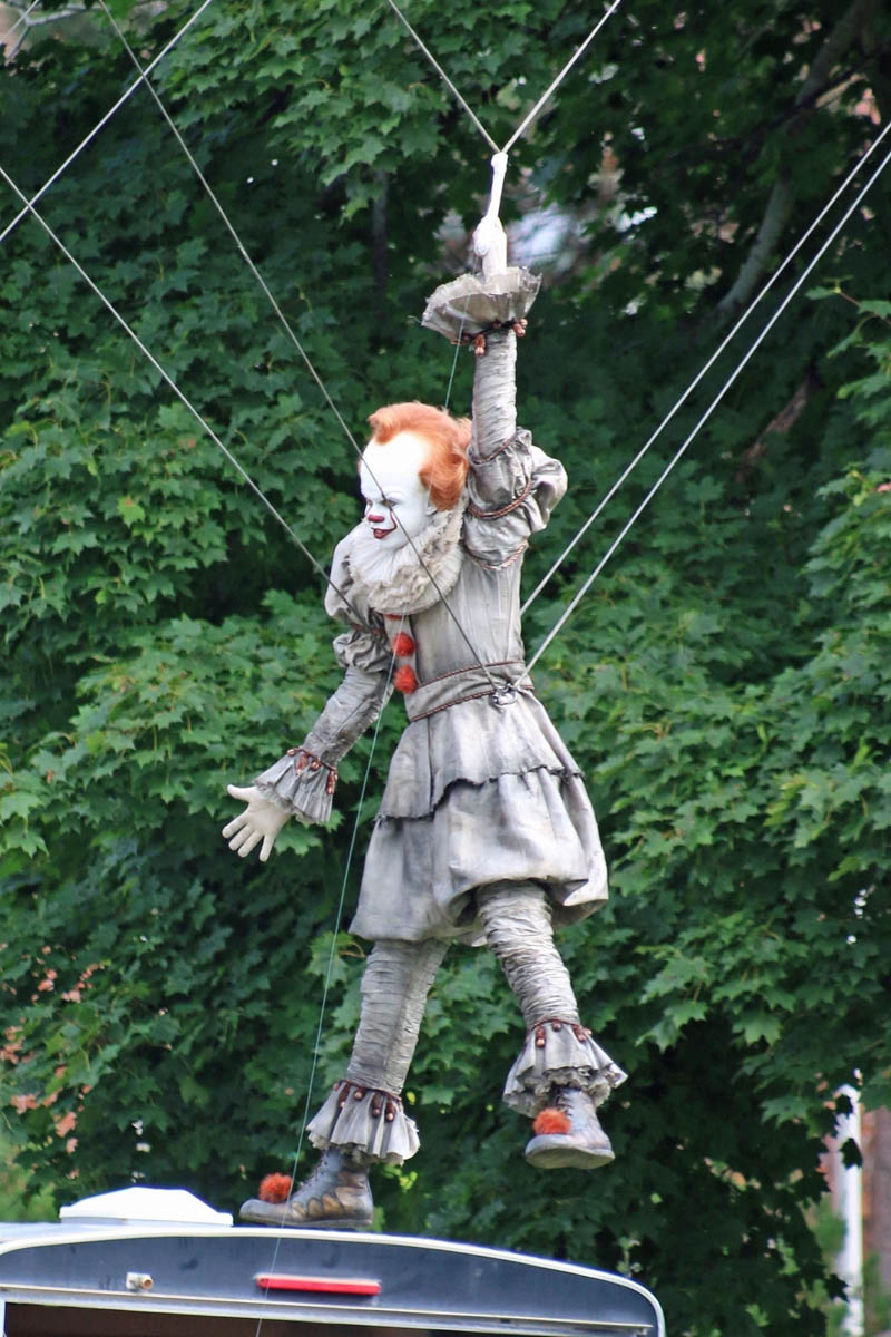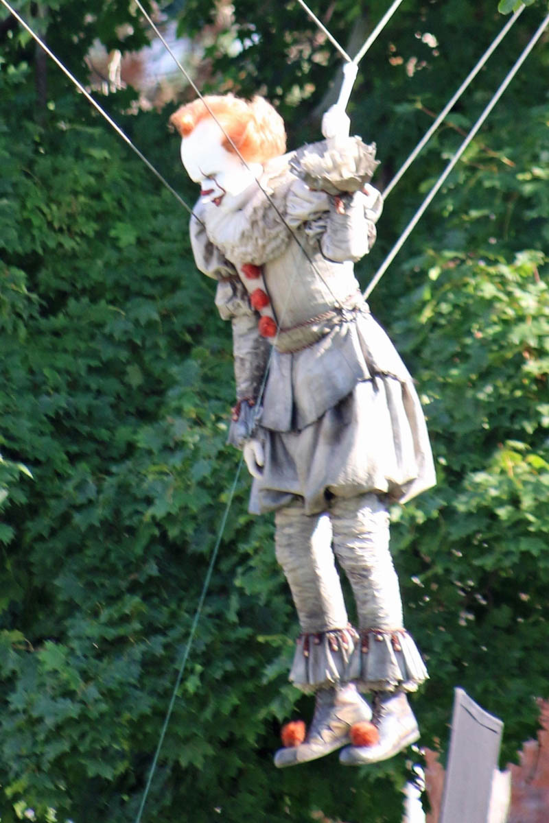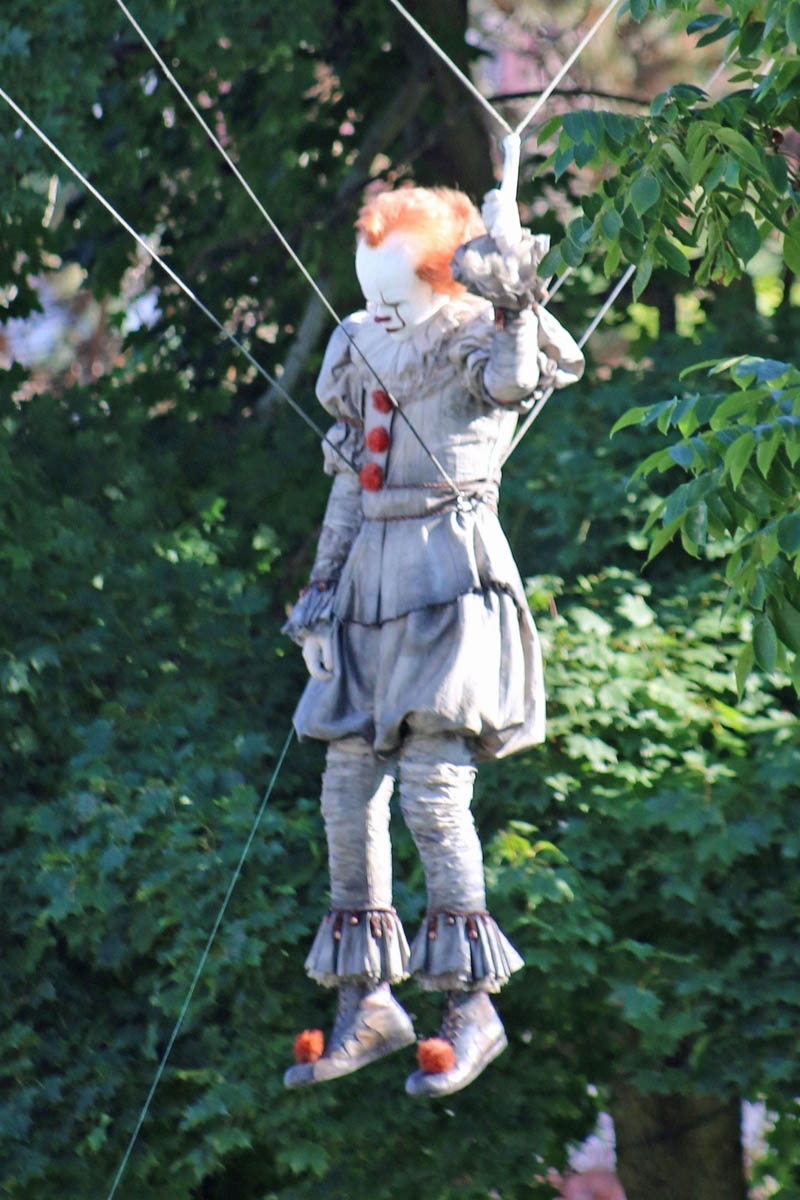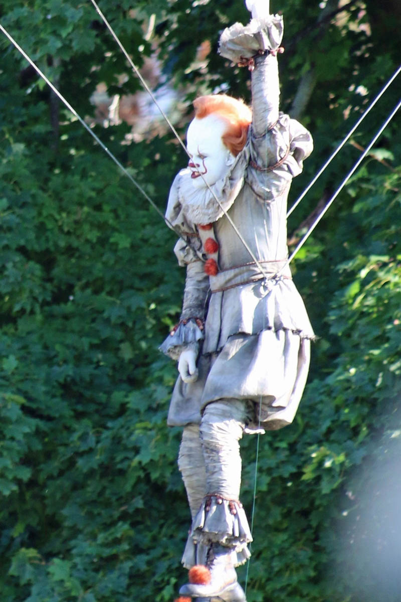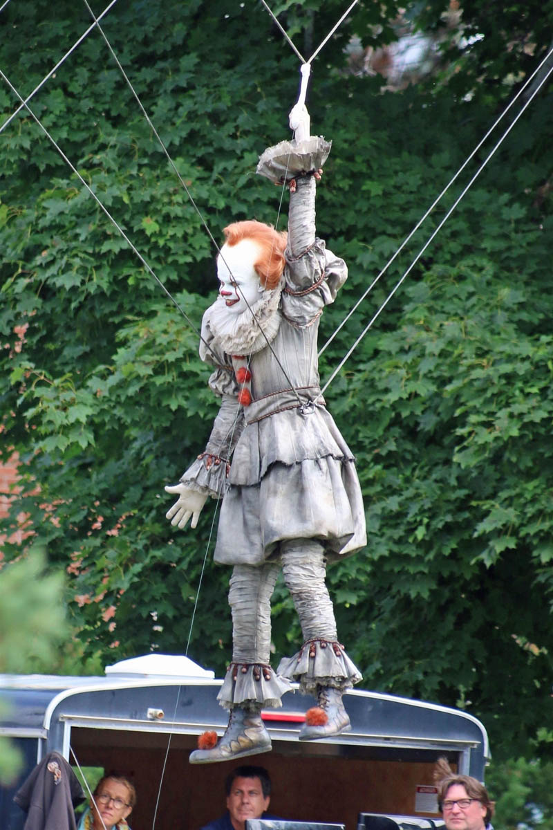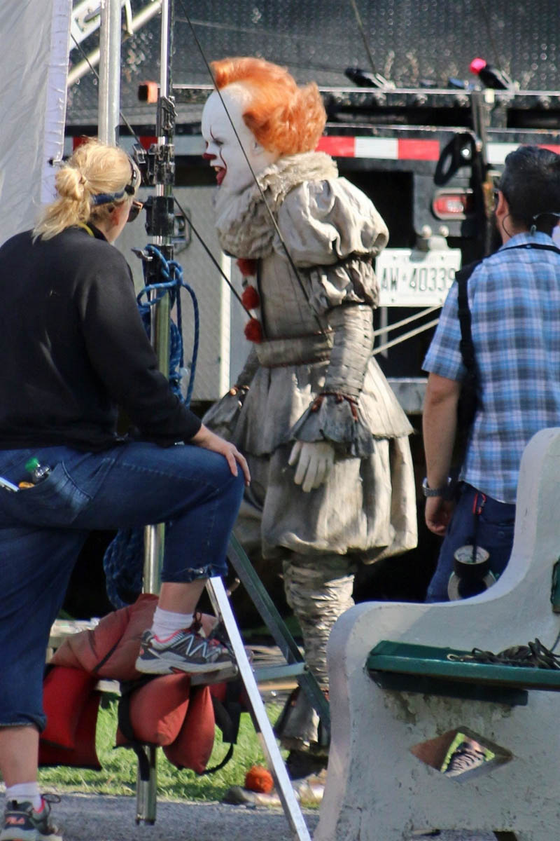 Here are photos from the set of It: Chapter 2, showing Bill Skarsgard as Pennywise the Clown. Last year, after It came out, the internet developed a thirst for Pennywise because the internet has both notoriously awful taste (I don’t care how well Kayleigh Donaldson puts it, Thanos is a genocidal nutjob and a Bad Crush Object) and too much time on its hands. Let’s be very clear: Pennywise is NOT HOT. Pennywise is some kind of spider-alien-demon with a penchant for clowns and Elizabethan fashion. He is NOT HOT. He is, in fact, super gross. He has horrible dental hygiene and a tendency to drool and his hair is ludicrous. Again: NOT HOT.