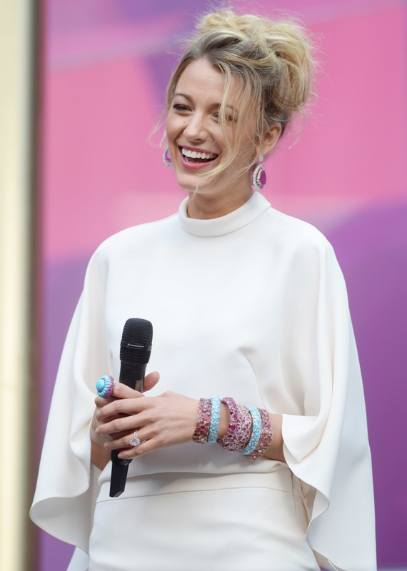 Blake Lively was at the Chime For Change event in London this weekend. Her best friend Florence Welch performed. Blake took the stage in a white dress. She hung out with her husband there too, and they were photographed, together, not running away. Which means we now have new file photos of the two of them. Most outlets have to keep using these ones which are two years old. So now we have some variety. Thanks Blake and Ryan.