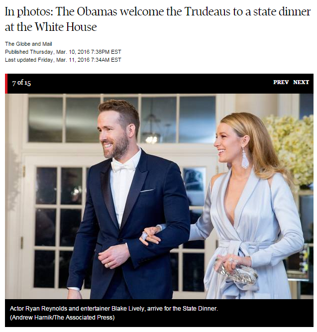 President Obama and Michelle Obama hosted a state dinner last night in honour of Canada’s new Prime Minister Justin Trudeau and Sophie Gregoire-Trudeau. It’s not an overstatement to say that American media has paid more attention to Trudeau than previous Canadian politicians, is it? There was a cheeky article about him The Boston Globe yesterday, opening with this paragraph: