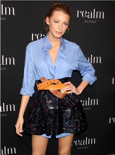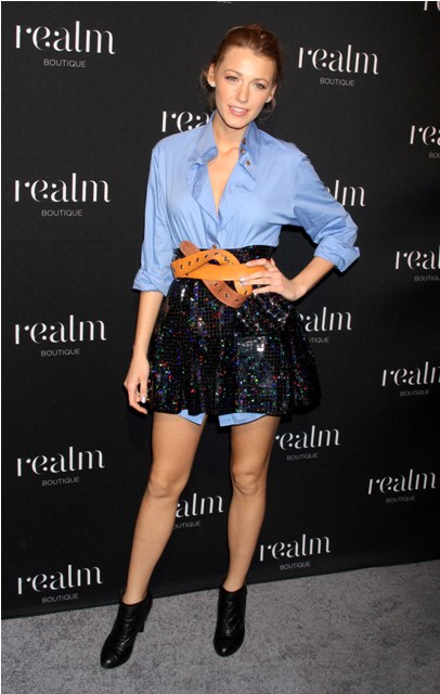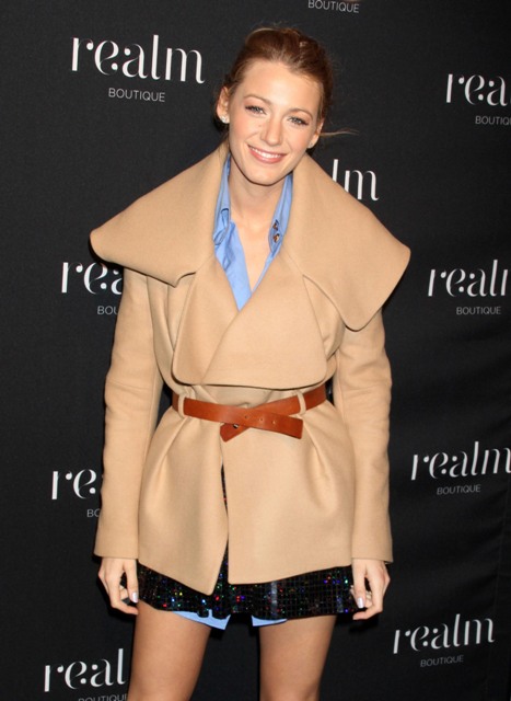 Fresh off swirling reports now that she's now at the top of the list to play Daisy in Baz Luhrmann's adaptation of The Great Gatsby, Blake Lively stepped out last night to attend the Realm store opening in New York. Coat, then coat off. They keep trying to tell me she’s a style icon or something. I wonder if she’s too literal to be considered so. There’s no imagination.