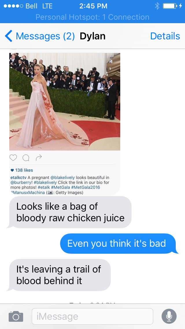 My friend Dylan, not exactly a fashion guy, texted me last night after seeing Blake Lively’s MET Gala dress on Instagram. Here’s what he said: