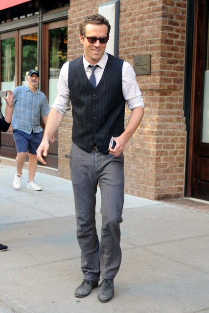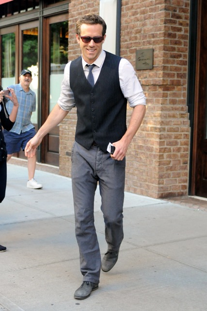Today Ryan was photographed again leaving his hotel in a waistcoat and really nice forearms with grey pants worn well. He is in town of course (and Blake Lively too) for a last big publicity push for the Green Lantern opening this weekend. There’s a screening tonight for it in Vancouver which I was supposed to go to, only there’s a hockey game that’s cockblocked my schedule. And I did want to see it. And I DO really, really want it to be good.
