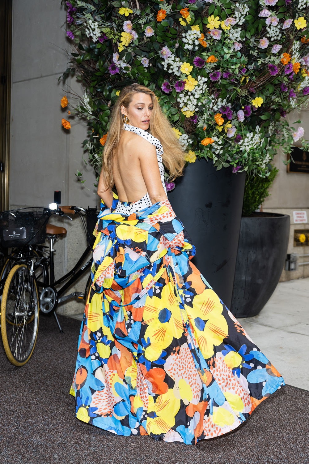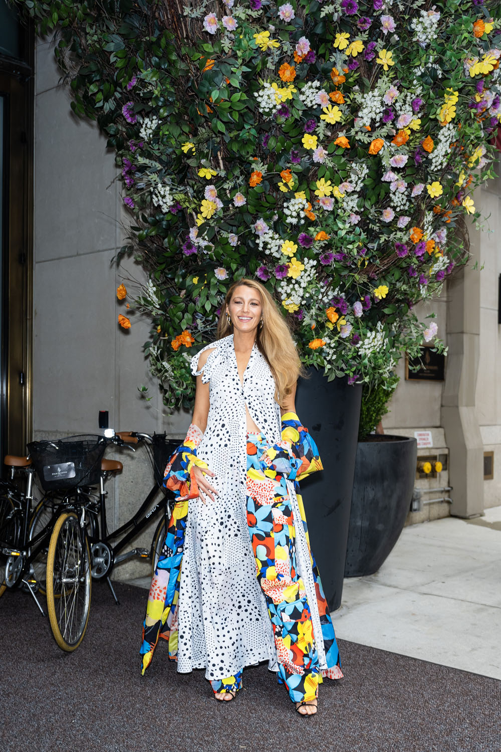 Blake, as we all know now because it’s never not mentioned, styles herself. Right now she appears to be hot on an NYC-based young designer, Olivia Cheng and her label, Dauphinette. Several of her outfits have been Dauphinette in the span of less than a week. Blake plays a florist in the film so the flower theme is flowering.