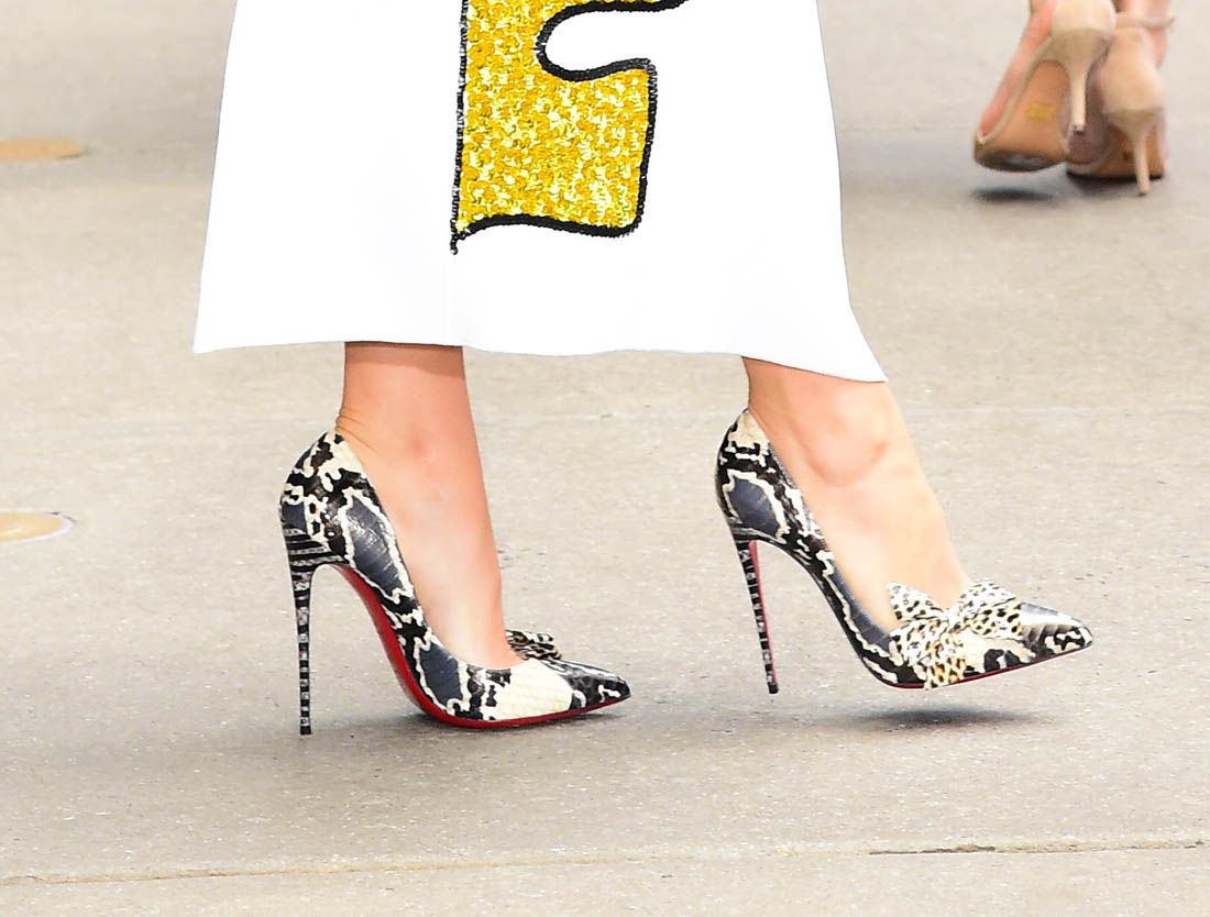 On Friday she was on The Tonight Show with Jimmy Fallon talking about her youngest daughter, Ines, as a “baby Viking”. They also dance battled. Here she is in New York this morning making the talk show rounds. The colour theme of the day so far appears to be yellow. So far there have been two outfits – a strapless gown with a big yellow flower over the right side, perfectly suitable for daytime, and an all-yellow flare-legged pantsuit which she can totally pull off because she’s so tall. A small quibble though about the pockets?