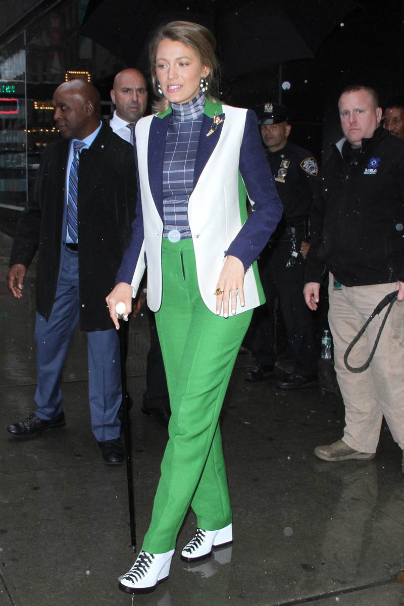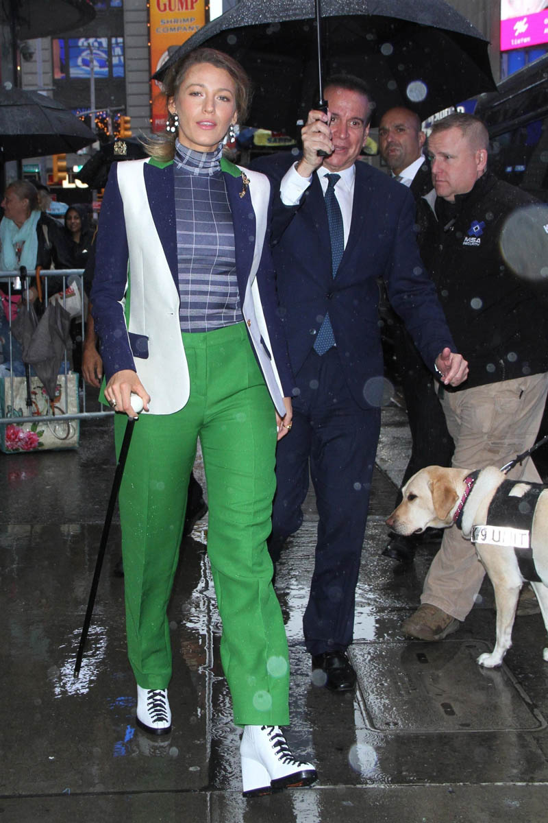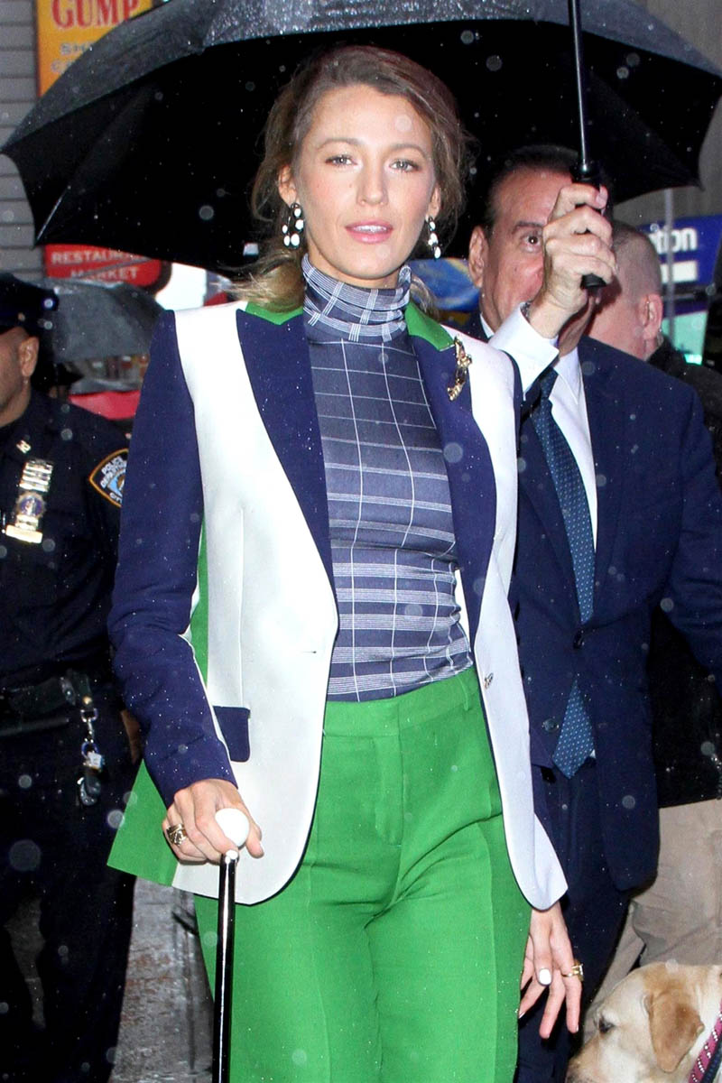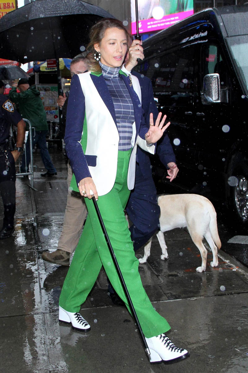 Yesterday, I described one of Blake Lively’s outfits as “P.T. Barnum meets Tuxedo Mask”. Now she’s just fully cosplaying as Willy Wonka walking around New York City with a literal cane. At first I thought that she was campaigning to play the Penguin in the next Batman movie but the backstory on Blake’s fashion cane is that she is channeling her director Paul Feig, a “noted cane enthusiast". Rich people need hobbies too. Paul’s style apparently inspired the look of Blake’s character in A Simple Favor and she’s been dressing in homage to that aesthetic throughout this press tour.