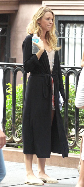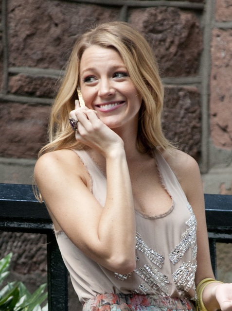 Anyway, here’s Blake in New York yesterday shooting several different scenes for Gossip Girl with Leighton Meester. What do you think of that upholstered hem on that dress?