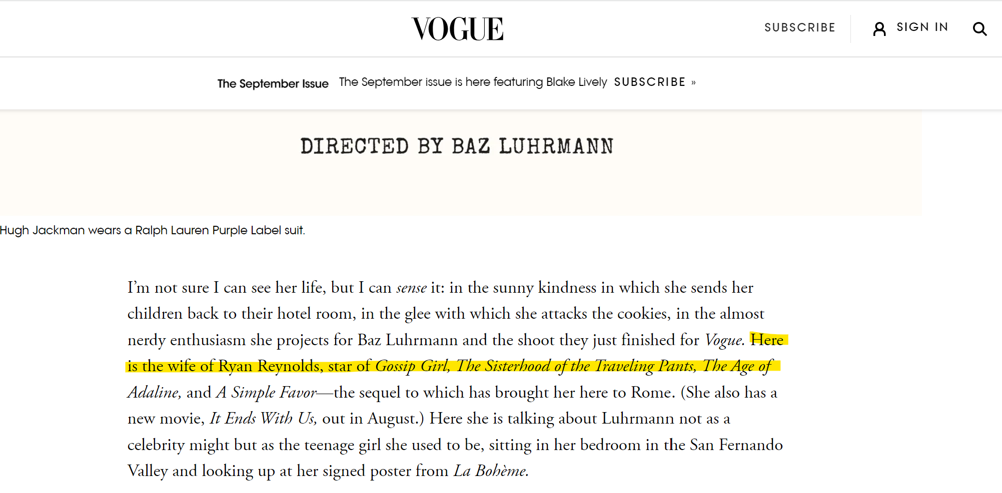 The shoot was directed by Baz Luhrmann, co-starring Hugh Jackman and the piece doesn’t reveal much about Blake but it does, for me at least, reveal a lot about the writer, Andrew Sean Greer, or at least about the motivation the writer was given for this piece. Because the thesis is not subtle. What Vogue and Andrew are screaming in this cover feature is that BLAKE LIVELY IS A MOVIE STAR. At one point Hugh Jackman even compares her to Nicole Kidman.