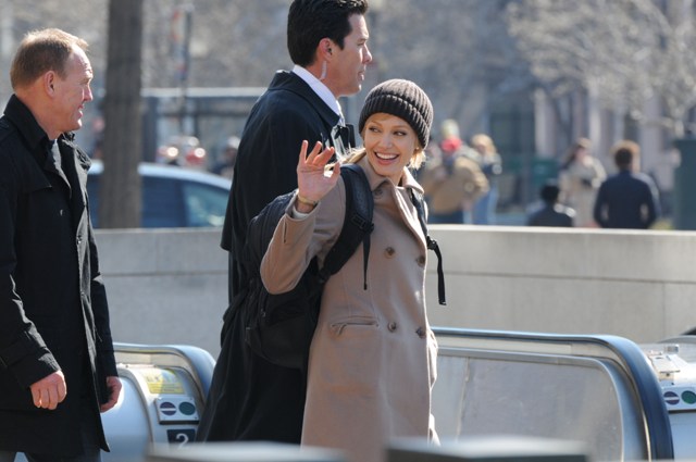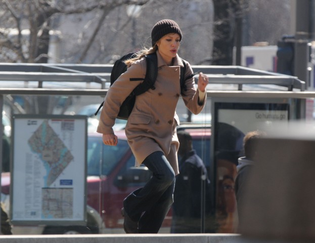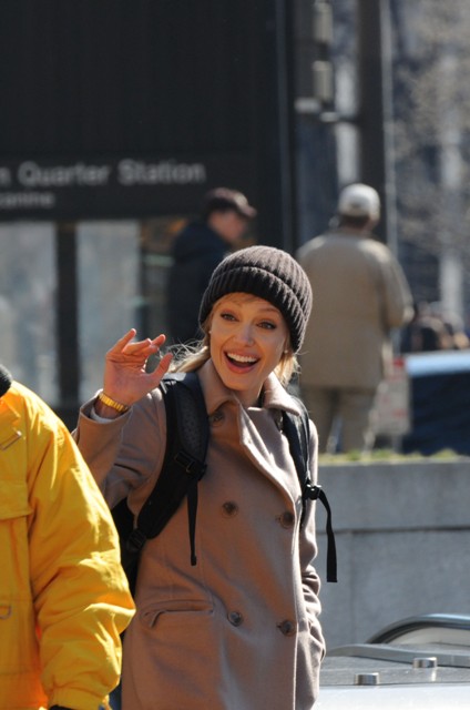 Angelina Jolie on the set of Salt today in Washington DC filming what looks like a chase scene. She is gorgeous as a blonde. Also appears much younger, non?