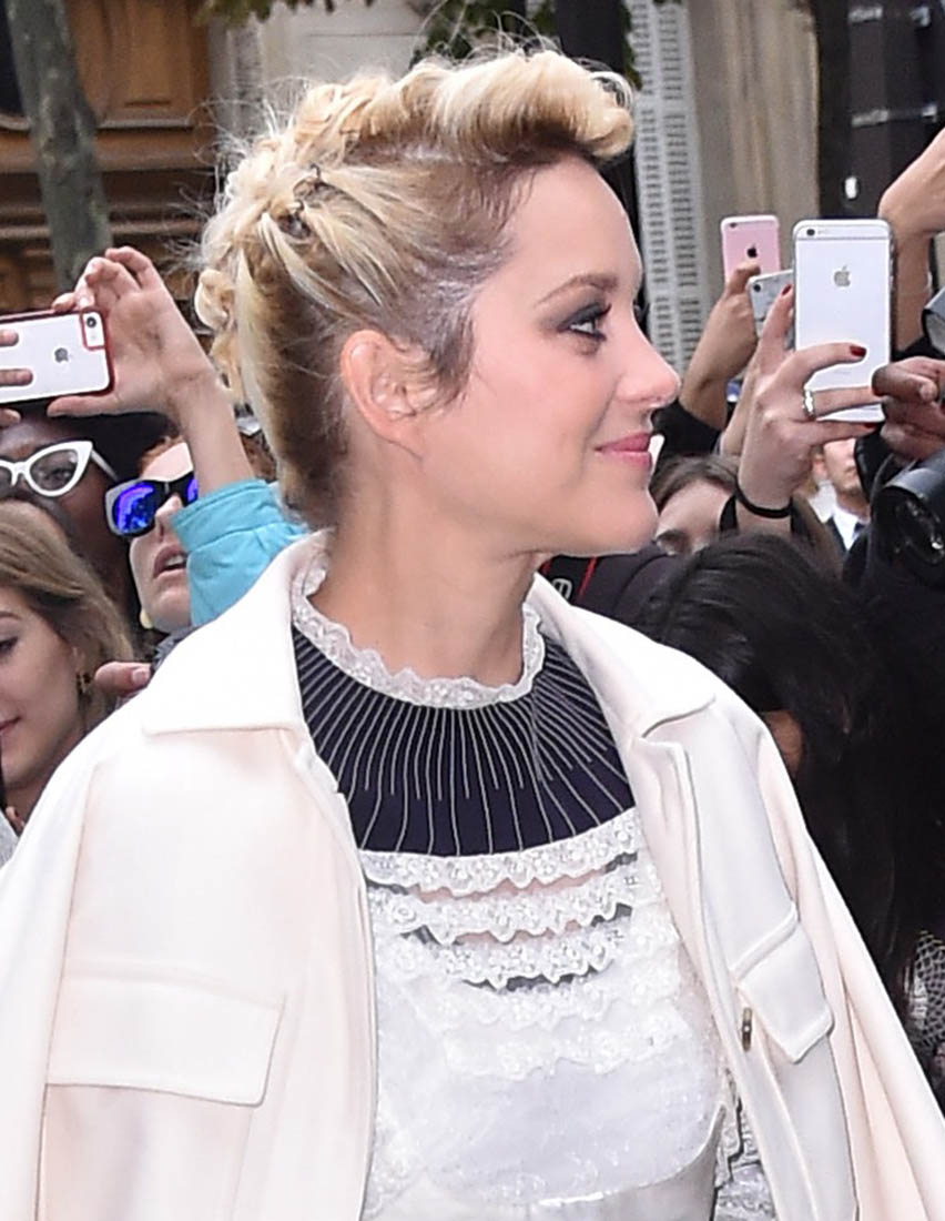 Marion Cotillard showed up at Paris Fashion Week as a blonde. I love this faux pompadour thing she’s doing. Which Miley Cyrus has been doing lately as well. How many more before it becomes a headline? “The hairstyle you all have to try right now!” Does it look as good is your hair is all one colour though? And really, really dark? Without highlights? I say this because there are always styles I try after seeing them on celebrities. And inevitably it doesn’t have the same effect because my hair is very dark, with no variations, so that you often can’t see texture. And with a style like this one, texture is half of it.