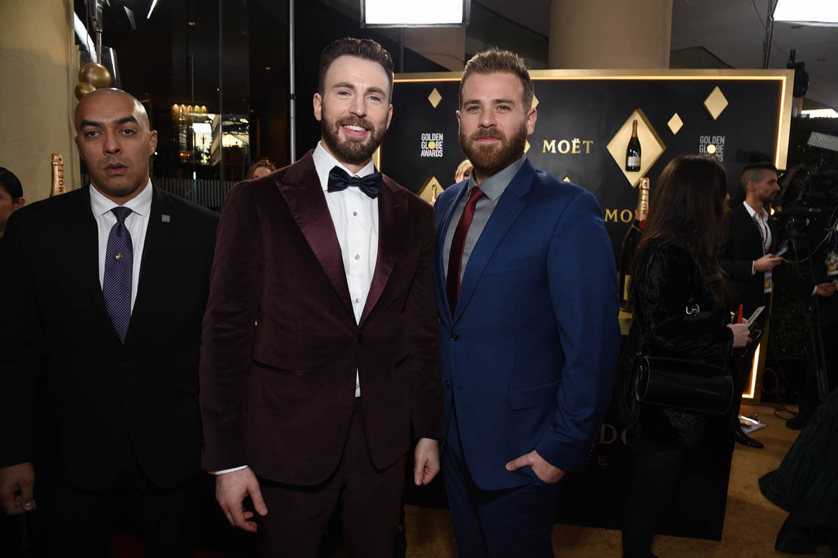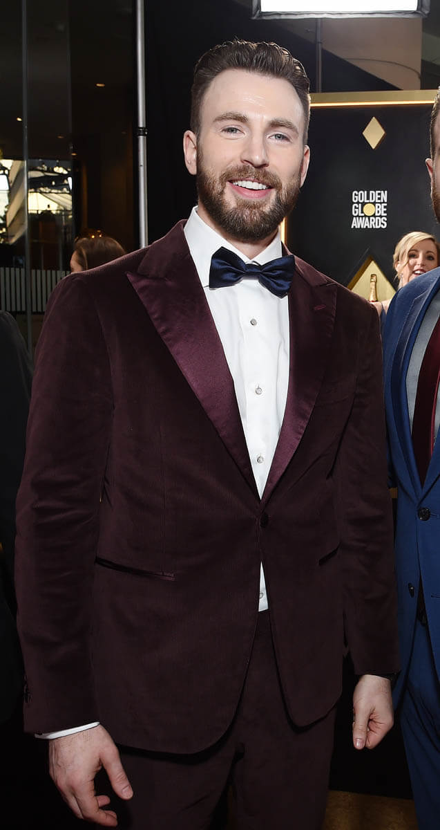Chris’s date for the Globes last night was his brother, Scott. They walked by the etalk platform but skipped interviews, waving at our camera instead. He looked great in that red velvet suit though. I don’t know if the colour is as rich and vibrant in these photos as the way it read in person: really striking, really elegant. He’s turned up his steeze over the last year and we really should appreciate it.