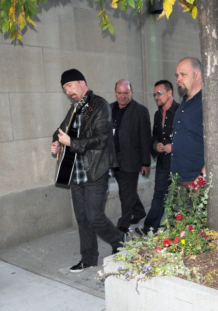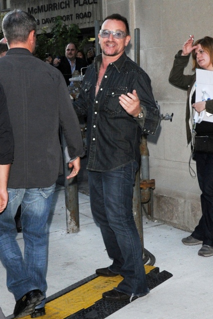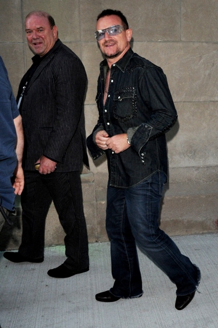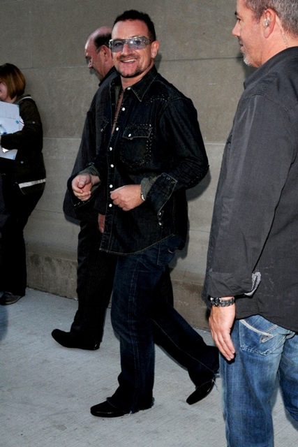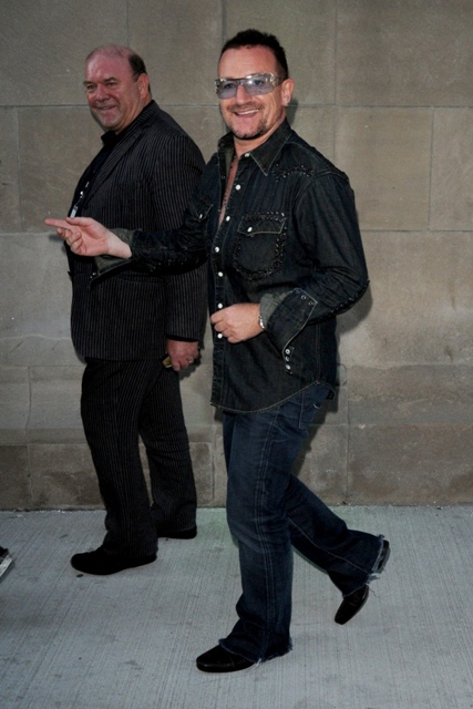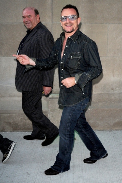Bono’s motorcade has been attracting fans all over the city. He invited one into his SUV the other day for a photo. Look at him, pleasantly waving, not disturbed at all by the pap presence.