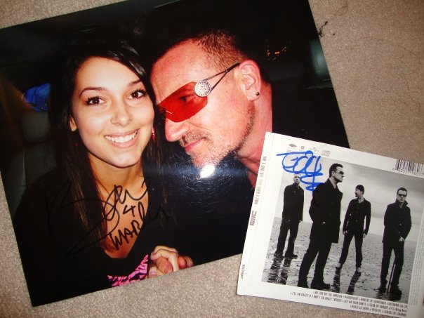 The next night, my mom went to u2's secret gig at MTV and waited outside for bono with an 8x10 of the picture of me and him. It caught his attention quickly and he said "Marley! I love Marley! Row 4 tomorrow right?!" I can't believe he remembered!!!