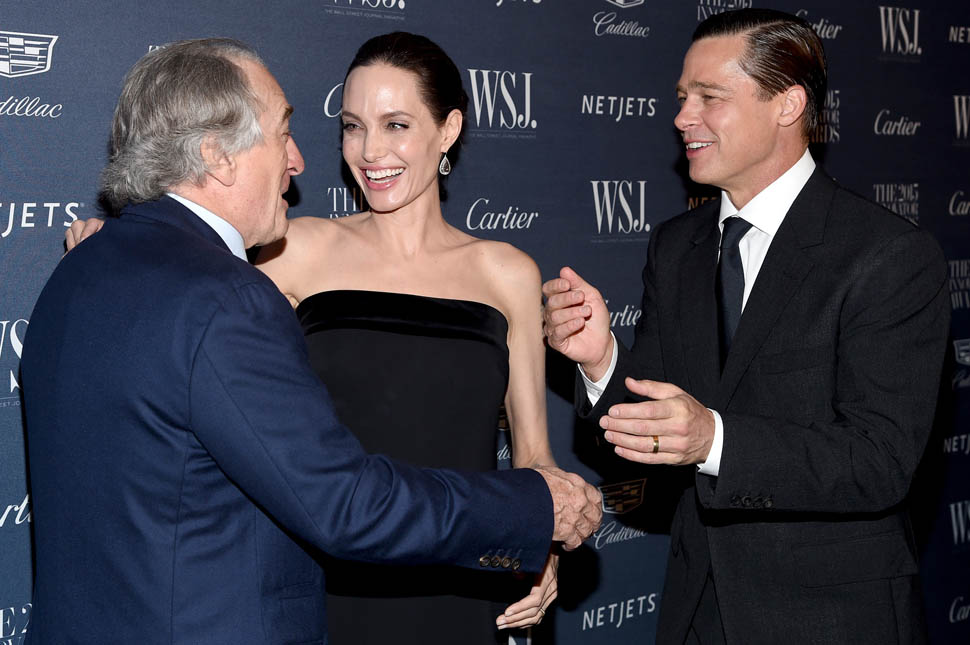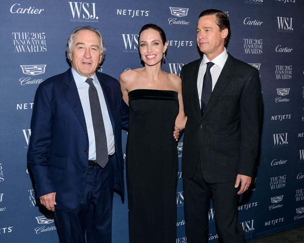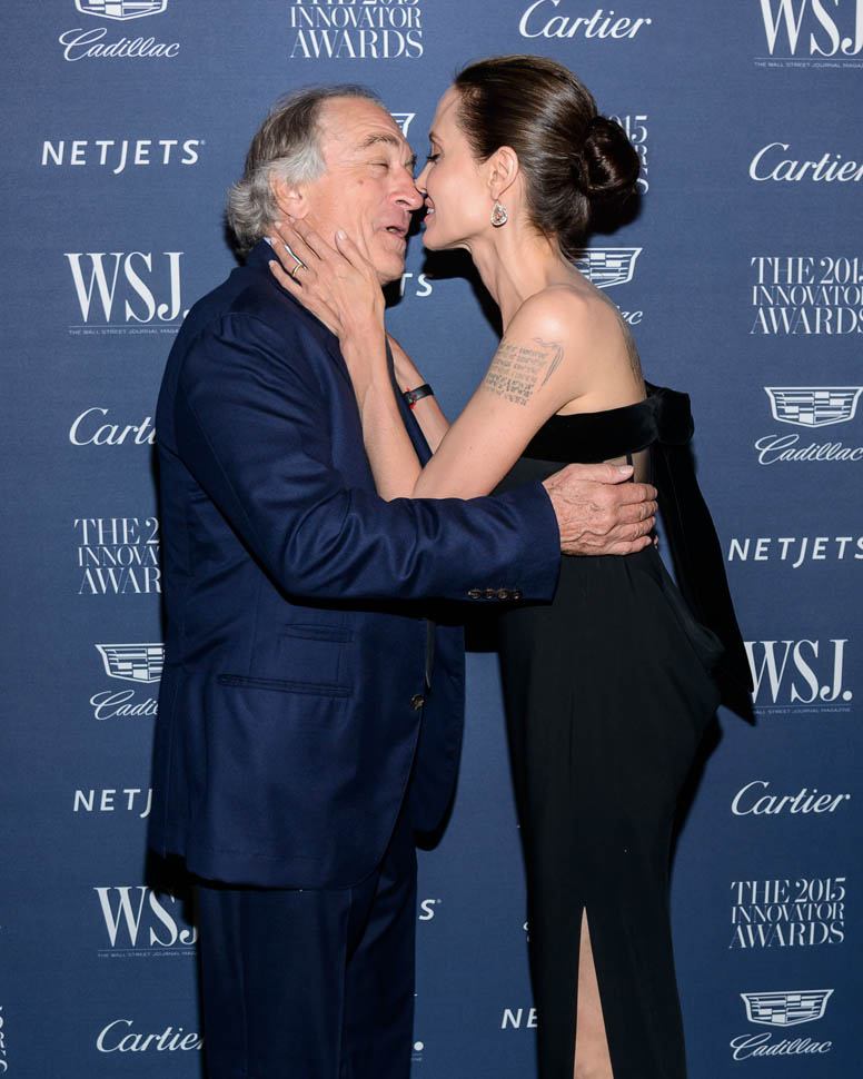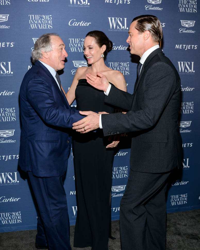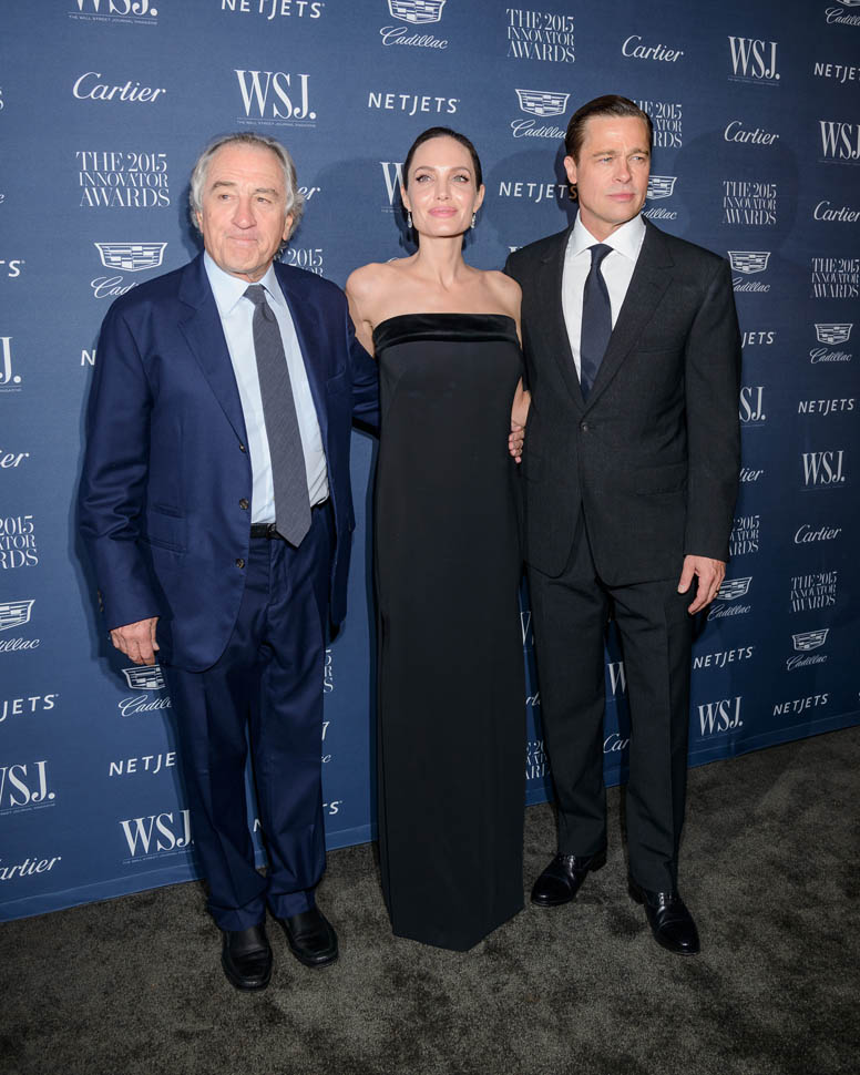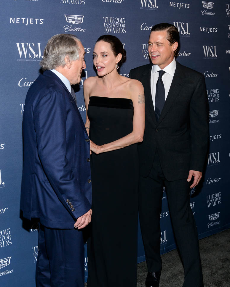 It’s Brange Week! Angelina Jolie was presented with the Wall Street Journal Innovator Award last night in New York. She and Brad Pitt attended the event and hung out with Robert De Niro and Anna Wintour. Tonight, as you know, By The Sea opens AFI Fest so they’ll be back in Hollywood on the carpet once again. Which means that by Friday I’ll have posted about them for five days in a row. That hasn’t happened in a year or more. This makes me happy.