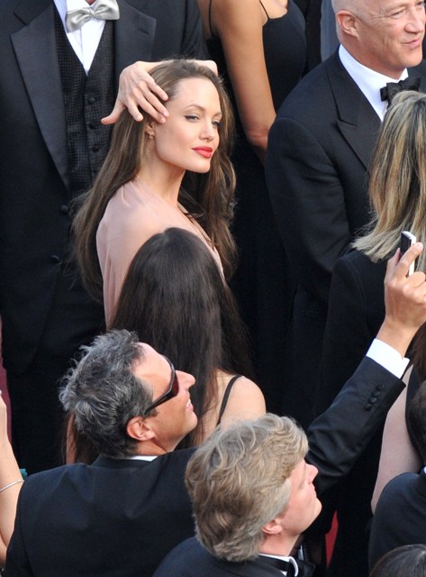 A show in colour. The Jolie loves colour in Cannes. Bright yellow, bright green, last night it was pink. Looks more nude and muted in photos but in person this Versace had some pop. She had some pop. From head to toe. No conservative black. Instead, gauzy, drapy, sexy, and a very naughty slit.