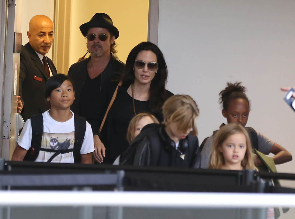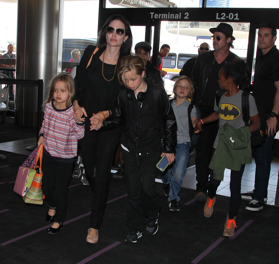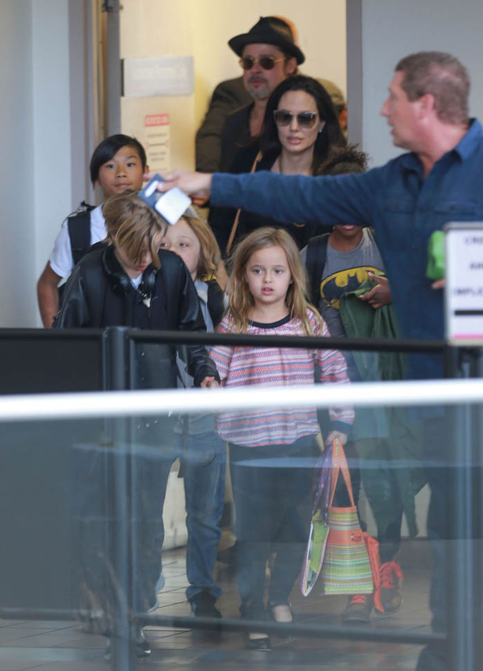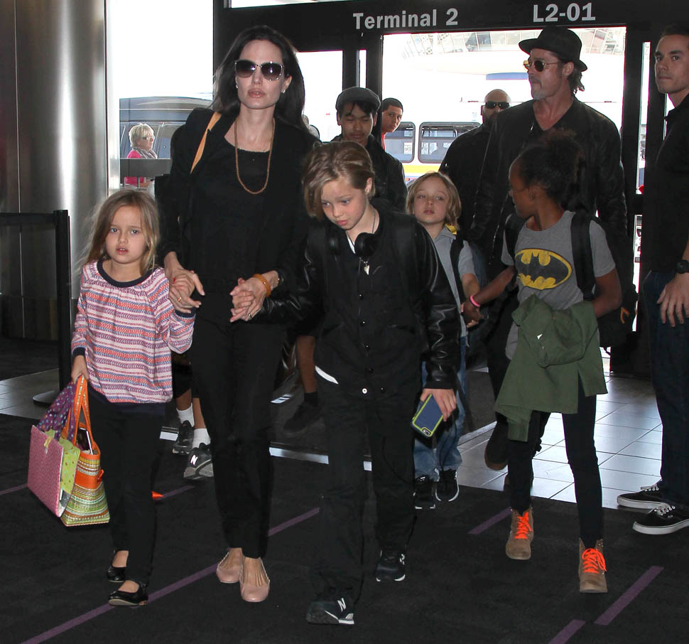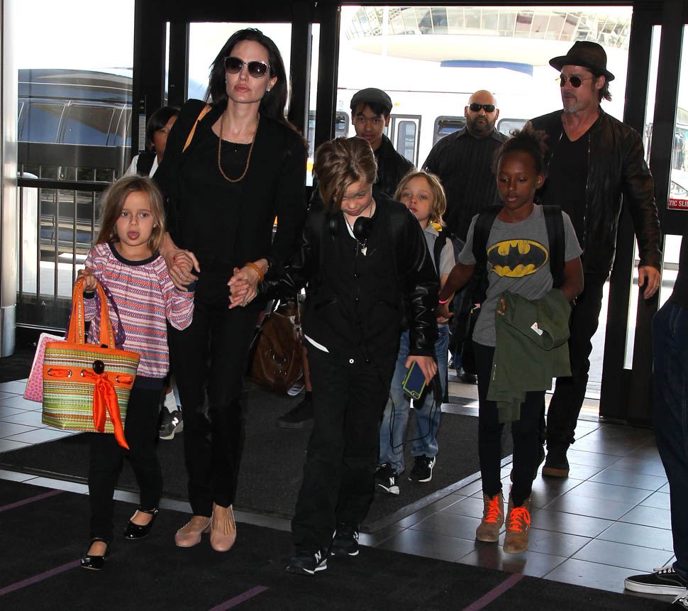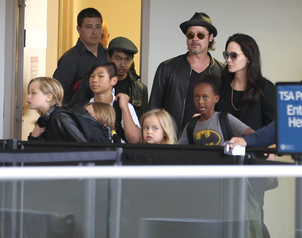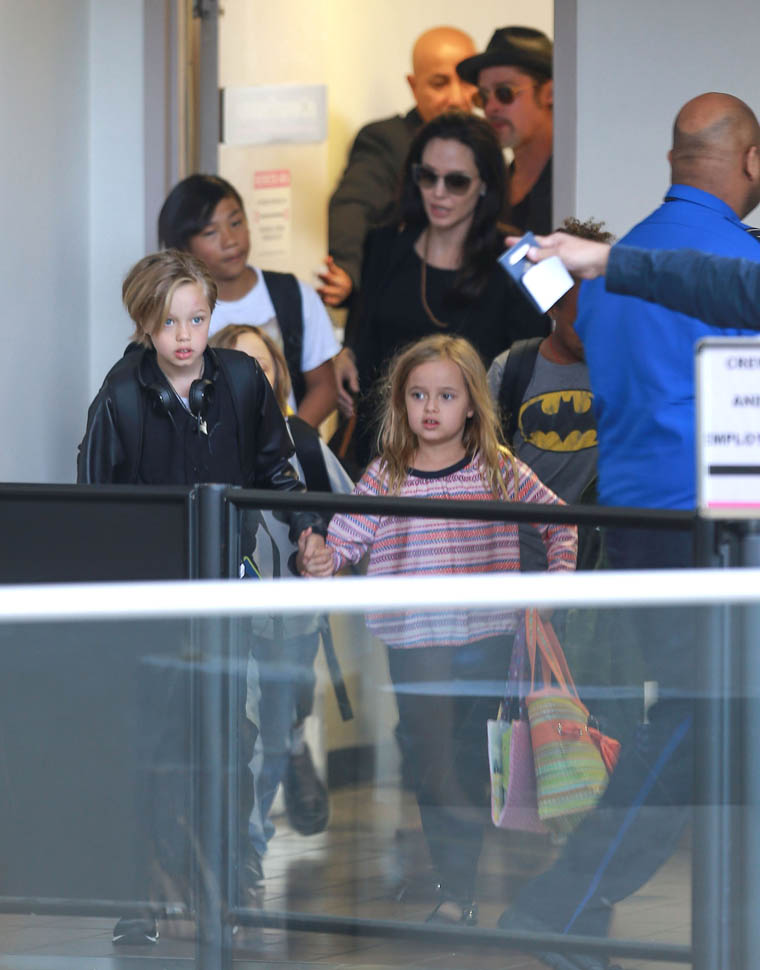 So there’s the Kate Moss way of behaving on a short flight…and then there’s Brange, with all of their children. Angelina Jolie and Brad Pitt flew out of LA on Saturday using the buddy system. Each child had to be attached to another child, except for the two oldest boys who, understandably, are now too cool to hold hands. They flew commercial to Paris. Then, after a two hour layover, flew commercial from Paris to Nice. During the second flight, they sat in coach. Click here to see some shots of them in the economy cabin.