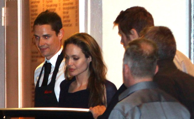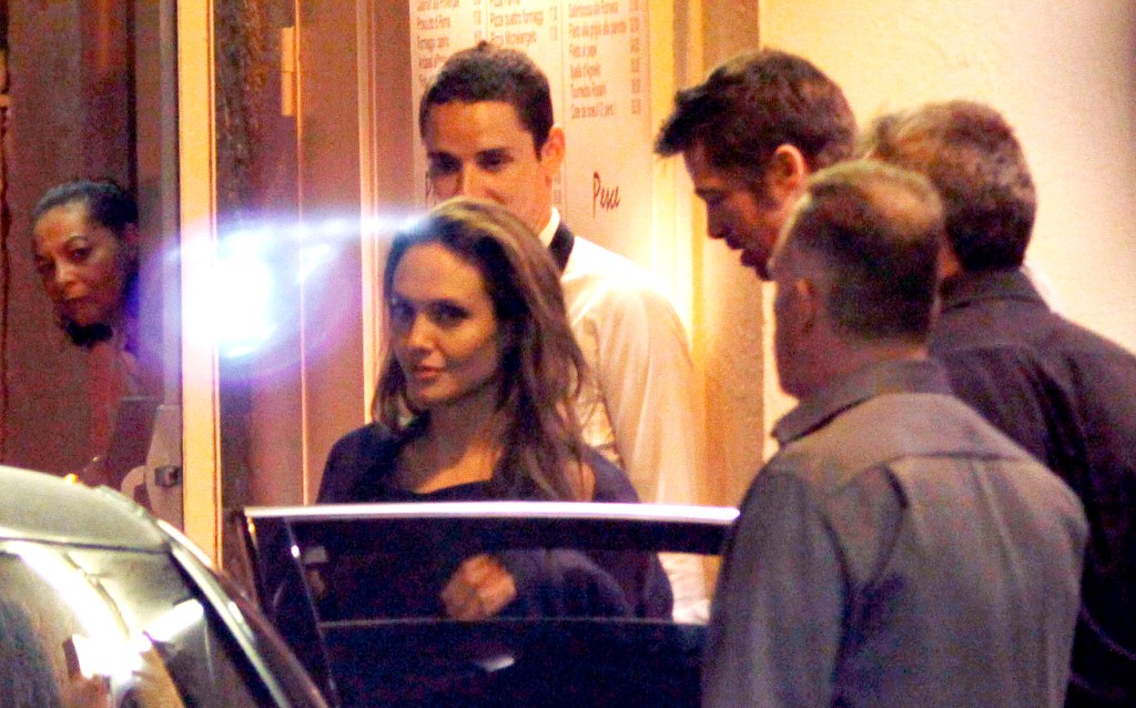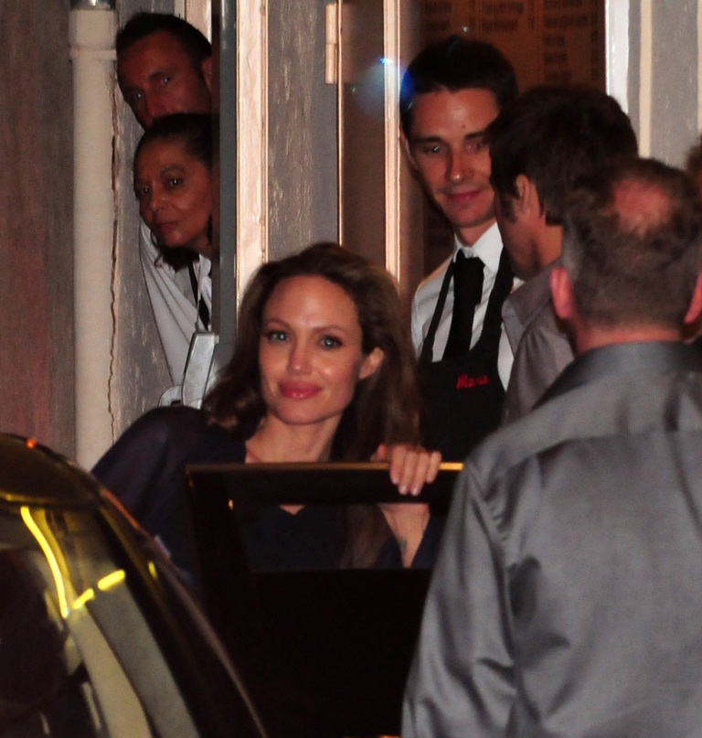 Inside the restaurant during dinner: barely any makeup but her skin was glowing. She’s thin, not her thinnest, but she’s thin. Am told Angie seemed tired, at one point leaning her head against his shoulder as he stroked her back. She had a glace of wine, he beer, and towards the end she looked up at him and he rubbed her cheek with his thumb, like ok baby let’s put you to bed now.