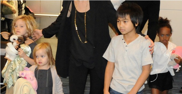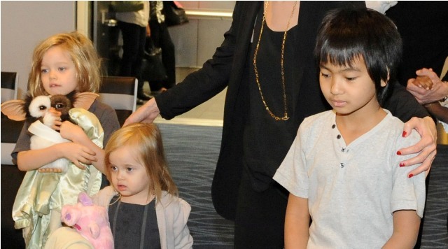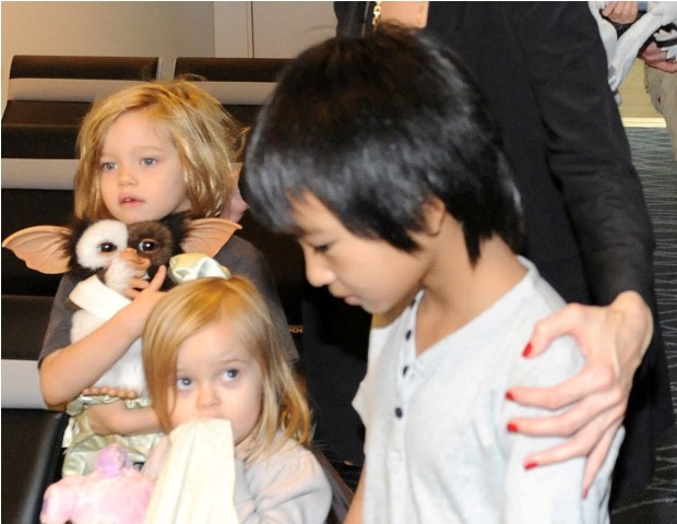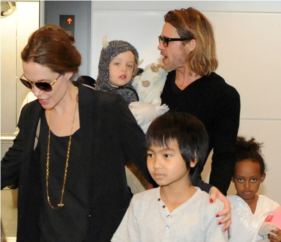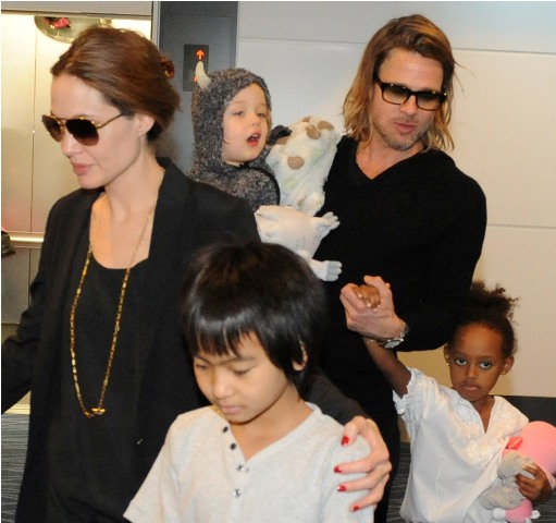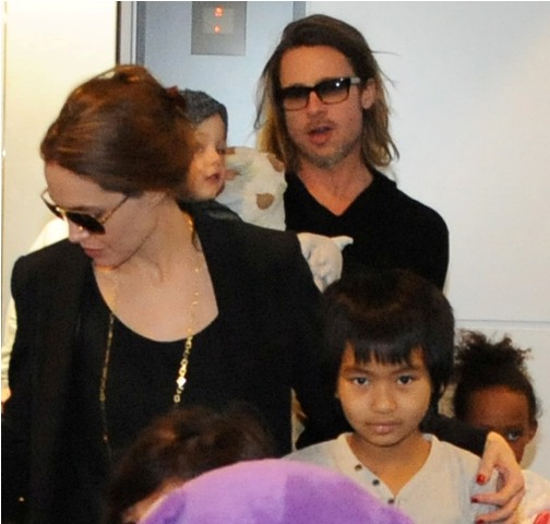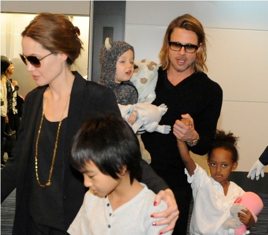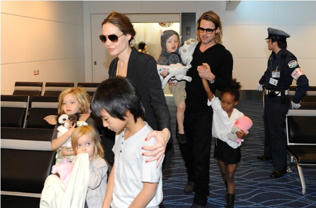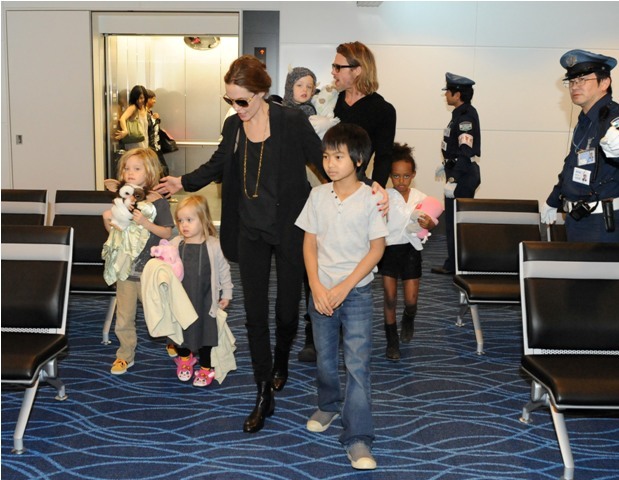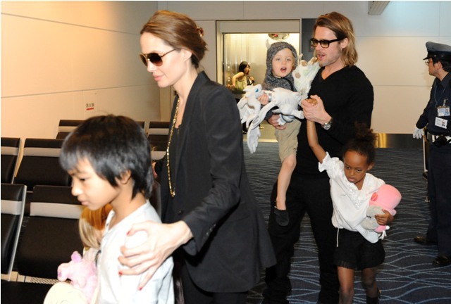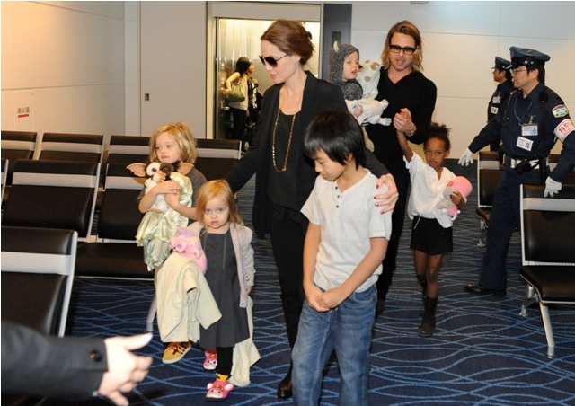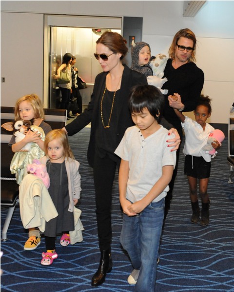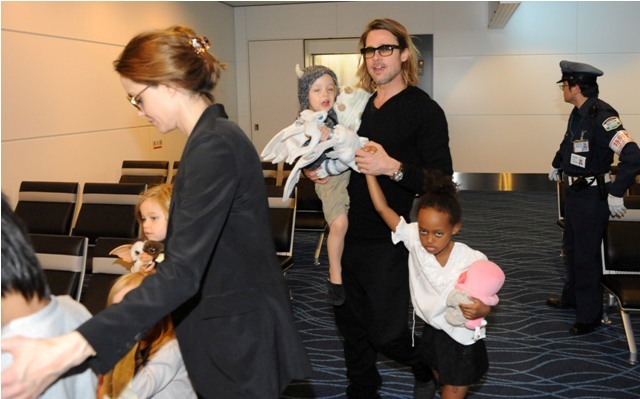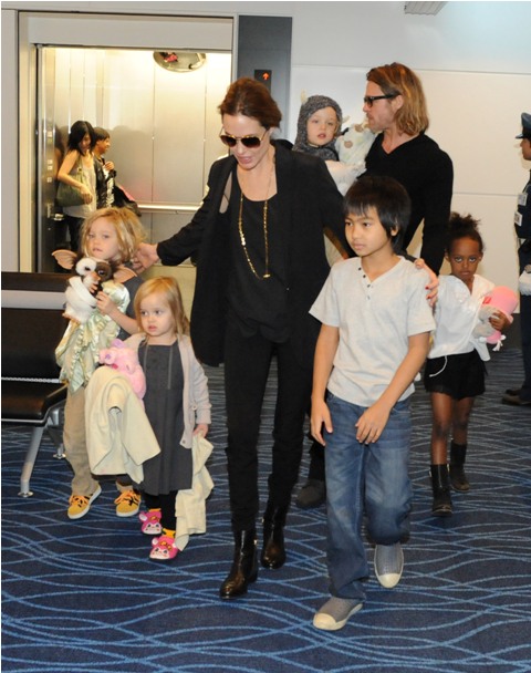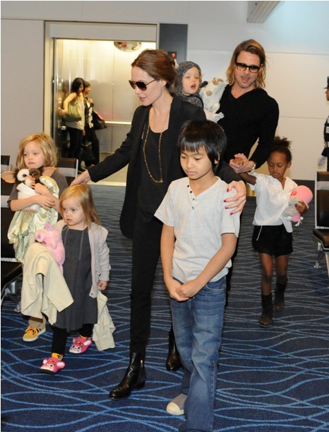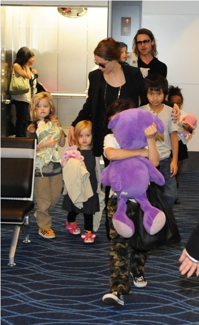 The Brange and all the children left Tokyo today. Here they are, trudging through the airport with their various sleep aids and toys and pillows after Brad and Angelina worked the sales pitch for Moneyball. All in all like 48 hours.