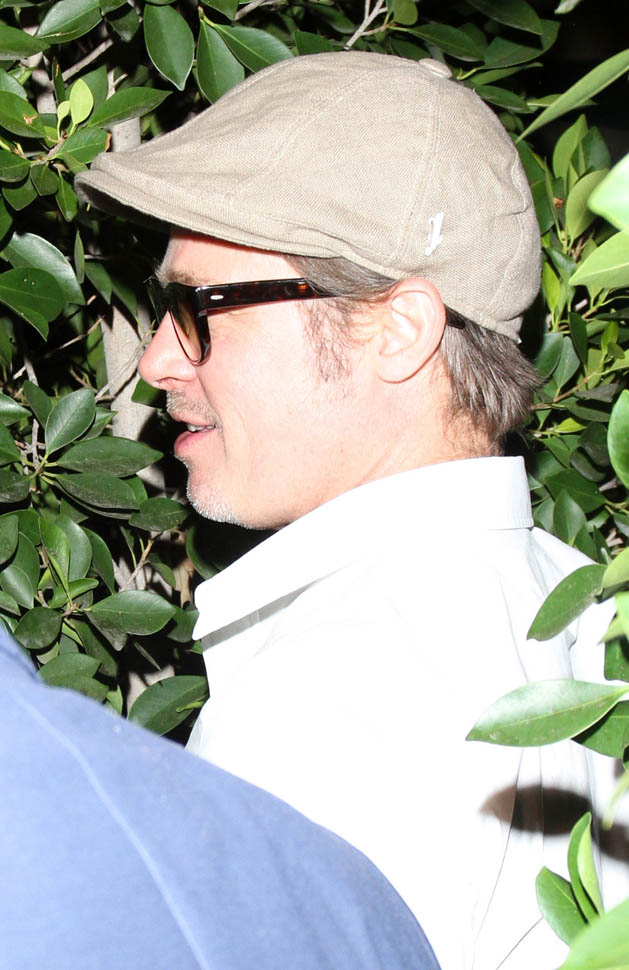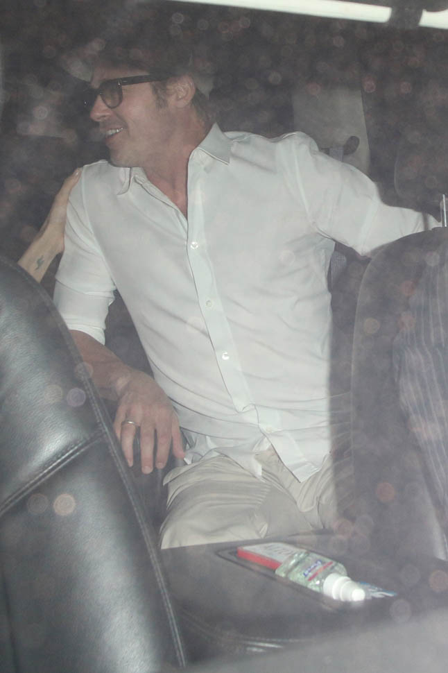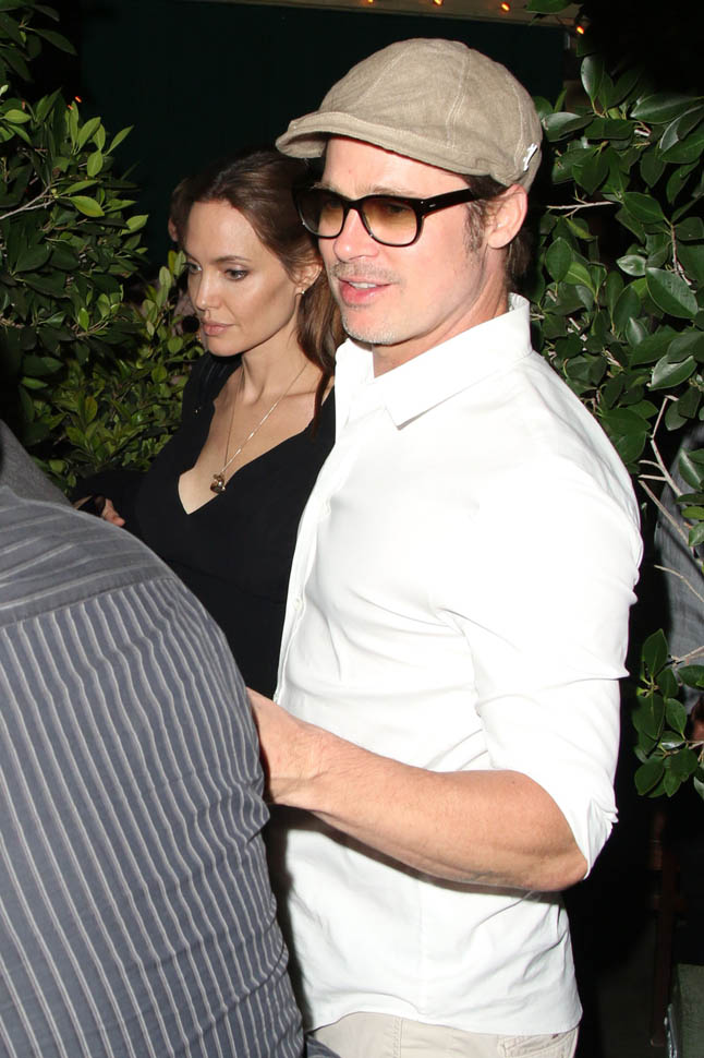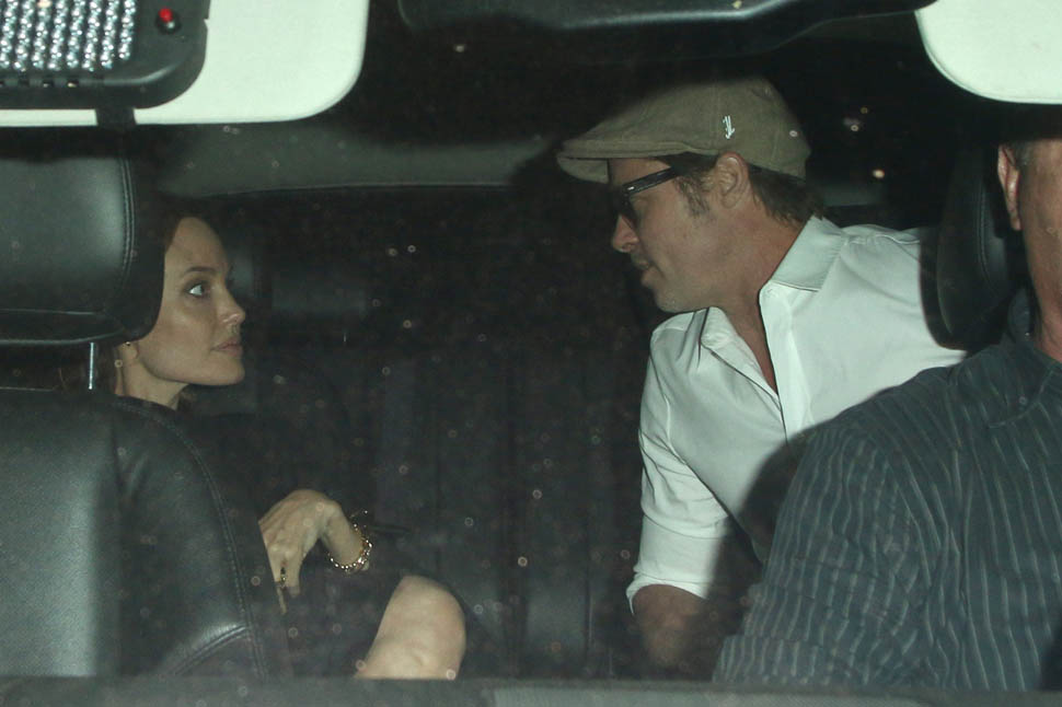 Brad Pitt and Angelina Jolie went out for dinner on Saturday night at Ago in West Hollywood. They wore their uniforms: black for her and those everyday pants for him. Unfortunately they did not make out in the backseat when they were leaving even though I’m imagining it in their faces. Come on. They’ve had a few glasses of wine. He’s lookin’ at her like he’s ready to go. You ever see them make out in the backseat? It was in Cannes a few years ago. They went at it as soon as they got into the car. I can’t find the YouTube but you can see it here.