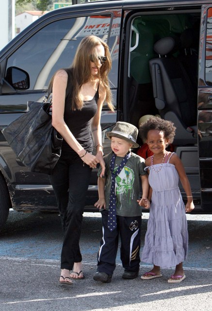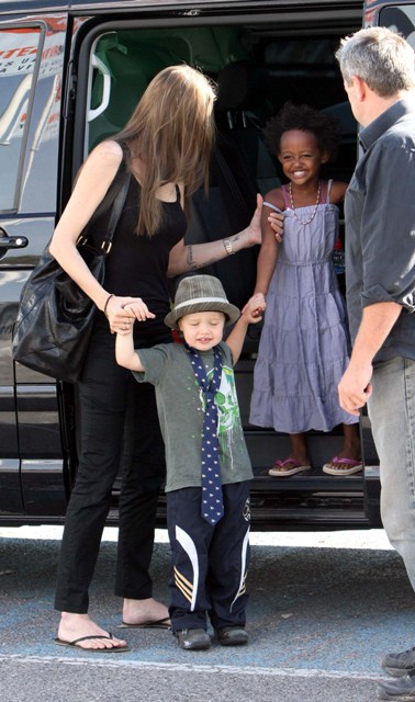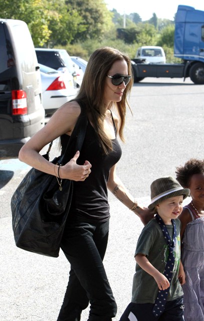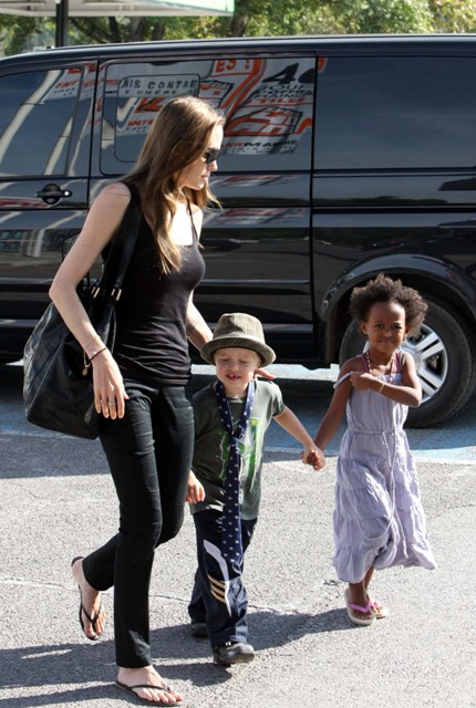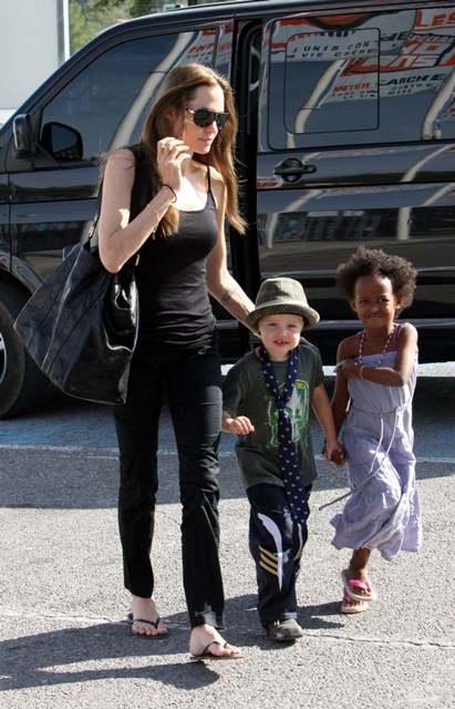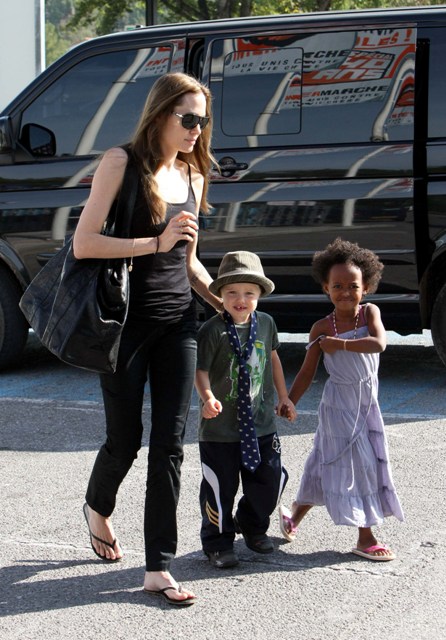 And finally, after a few days in the Middle East, the Brange is back in France where Angelina was spotted with Miss Zahara and The Chosen One who seemed super excited to be out with mom on a grocery run. So much so that Miss Z left her attitude at home. Shiloh is killing me with her hat and tie. I say this with the emotional detachment of an aunt – kids have the most hilarious relationship with clothing. The Chosen One’s recent sartorial flair (remember last week’s sword?) is helping her win points in my heart. She’s gaining on her sister.