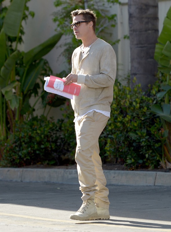 There was some kind of art event – I think – at Paramount Studios yesterday in Hollywood. Brad Pitt was there wearing his favourite outfit. His only outfit? It’s the only thing he ever wears! And the thinking used to be that if you wear the same thing, the paps won’t want to pap you – so believed Madonna and Gwyneth Paltrow. But, please, he’s Brad Pitt. He will ALWAYS get papped, even if he keeps on wearing the same clothes. So I’m not sure it’s about the papping as it is about the fact that he just really, really, really loves those pants, the boots, and the jacket. And he looks GREAT.
