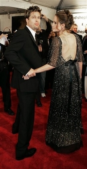 It happened! Didn"t think it was likely on this occasion but it happened. And as I"ve been telling you for weeks, they"ve been carefully planning their debut, especially around awards season...the time is clearly right for them to cement their relationship in public, given that the public is now largely pro-Pitt. Now about that dress...don"t like it. But really...who the f&ck cares? Gushing yes. And still...it is Angelina. It is Brad. Together. So yeah. I"m gushing. Very unapologetically. PS. First date jitters? Cute, non? I know, I know...it IS a little Rossum. But in season of poonies, isn"t this a nice smutty change?