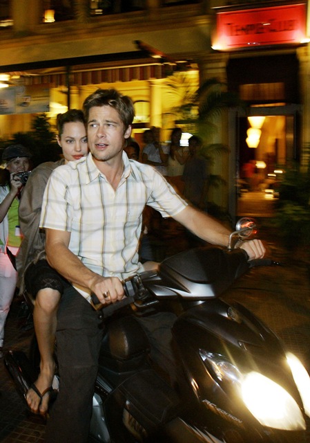 You’ve likely already seen the photos of them riding around Ho Chi Minh City yesterday. But have you seen the evening shots? Check out her red lipstick – Date Night for Mommy and Daddy? I’d like to think so. Always down for a little Pitt erotica, you know what I mean? Seriously though…look at Angelina and remember – these are CANDID photos. They haven’t been retouched, they haven’t been lit, they haven’t been shadowed and brushed and shaded to an inch of perfection...she is just that beautiful all by herself. And he isn’t bad either. Which is why I was telling someone the other day the most shallow, superficial sentiment – totally true I’m afraid – that I would have a hard time choosing between World Peace and being privy to their lovemaking. Surprisingly I was met with agreement on the other end. Not only because we’re both pervy but also because you’d go in there half expecting to be witness to the reinvention of the act itself…that if ever there was a couple that could invent a new move – like a throw triple axle with a sexual twist - it would be Brad and Angelina and be honest now, don’t lie…wouldn’t you want to watch? Don’t. Lie. Source