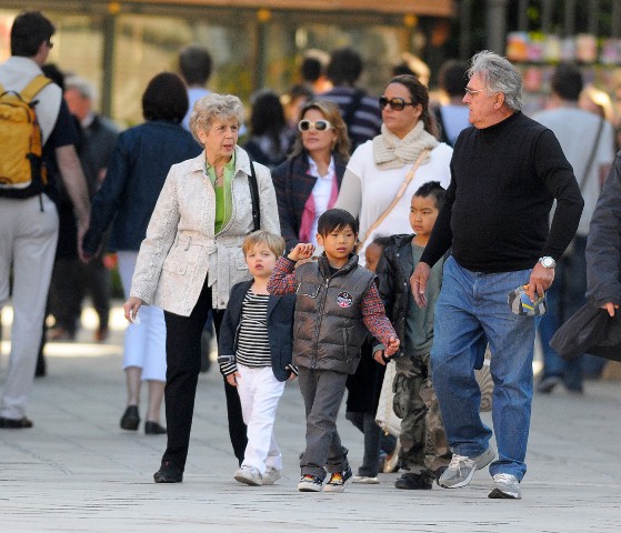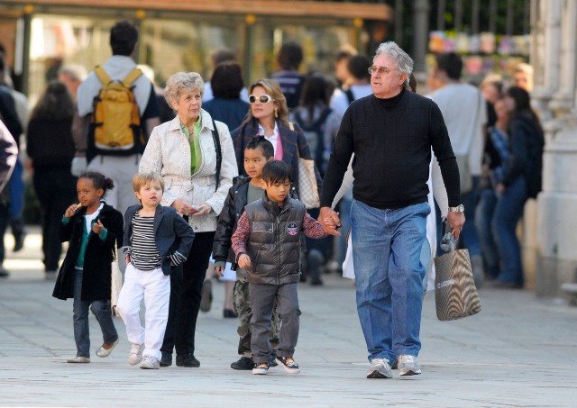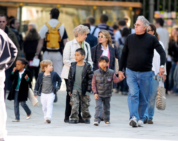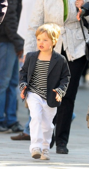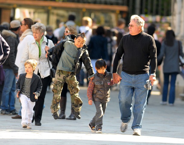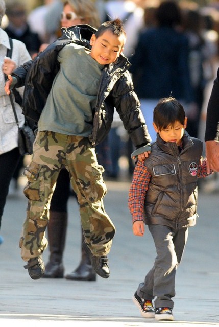 Check them out – Maddox, Pax, Miss Zahara, and The Chosen One Shiloh out with their grandparents today in Venice. Maddox has always been a bad ass. Still with the fauxhawk and, like any typical big brother, picking on his little brother. I like the action shot of Maddox launching himself off of Pax. I like the way Pax is holding on to grandpa’s hand.