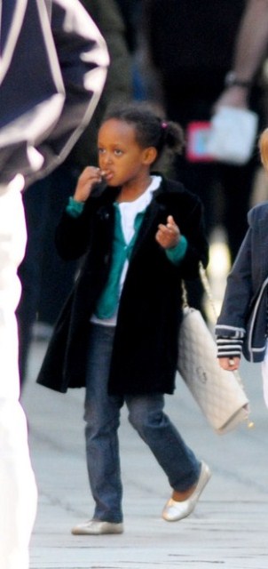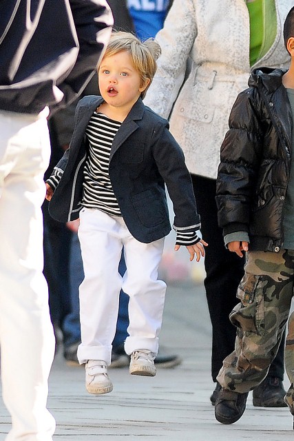 And then there’s the Shiloh steeze. Come on. Admit it. She’s owning that jacket and those stripes. She’s also copying her biggest brother, punking around like she’s looking for a trampoline. I bet you she worships them. Unlike my girl Miss Zahara who wants nothing to do with all that sporty business, hell no.