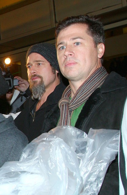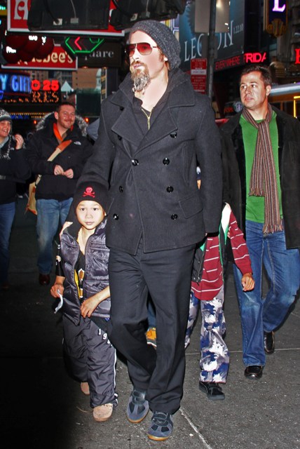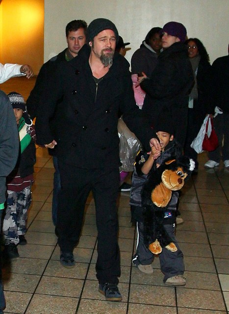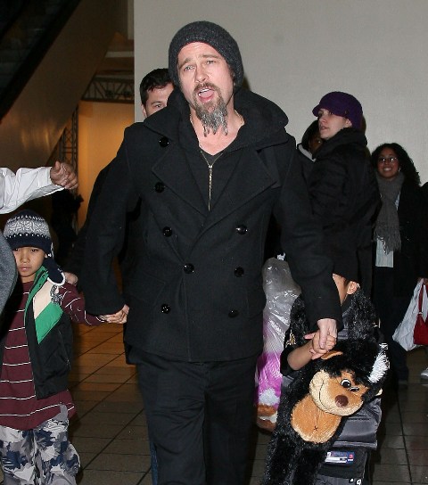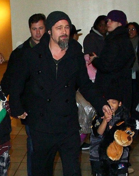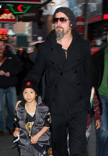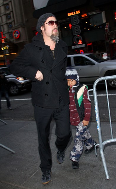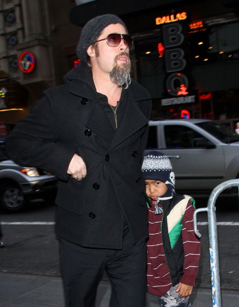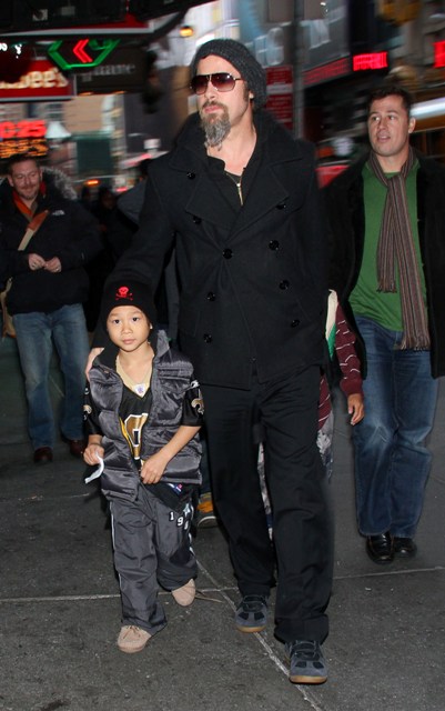 Here’s Brad with a pouty Maddox and a skull-toqued Pax, joined by Brad’s brother and his son, on a Man Night in the city. He still won’t shave that scraggly sh-t off his face.
