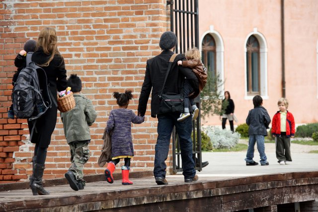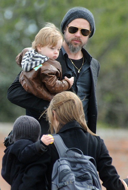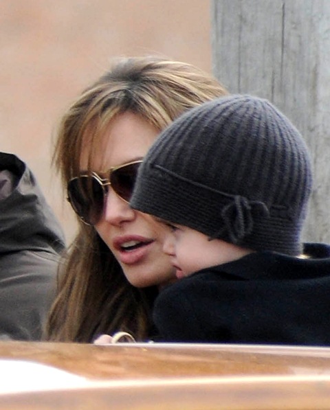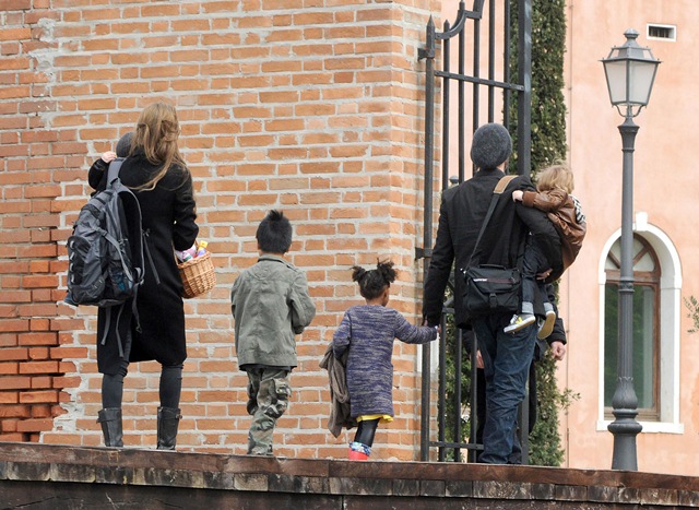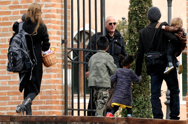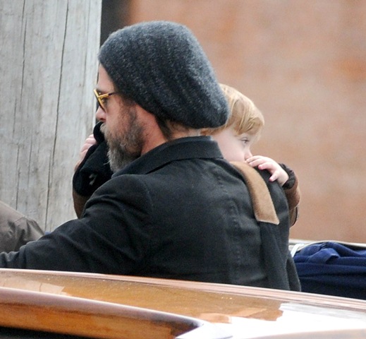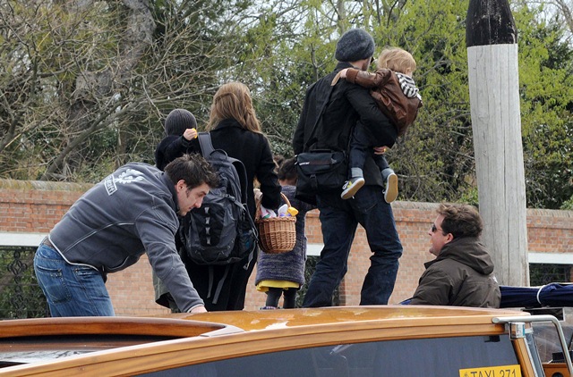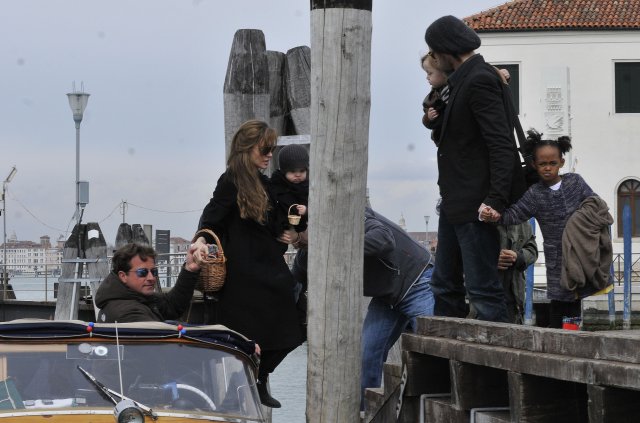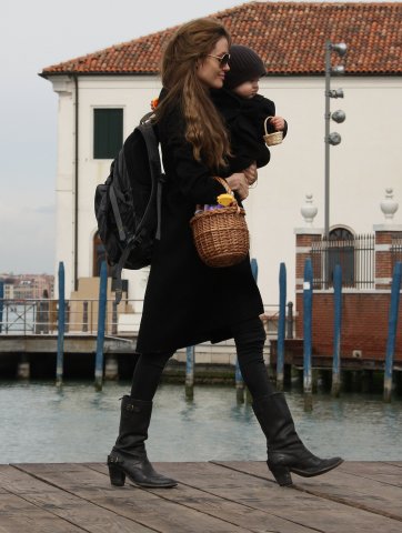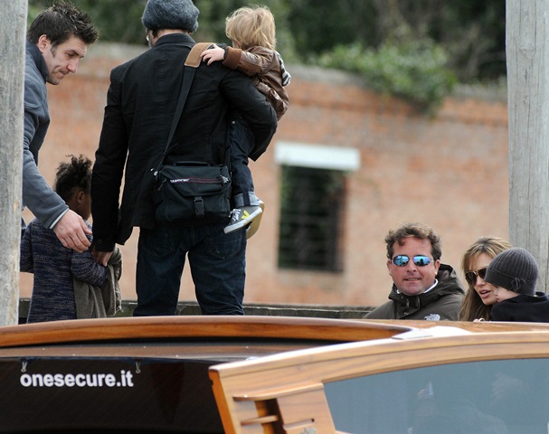 I guess if I had their resources, I’d do the same thing. On Saturday afternoon, the Brange took their children via boat to nearby San Servolo Island because they had rented it, yes they rented the island, for their private Easter Egg Hunt. Here they are, with all 6 children and their minders, arriving for their adventure. Miss Zahara’s Easter bitchface is some serious sh-t. Love her so much. But Angie’s legs in those boots are frightening.