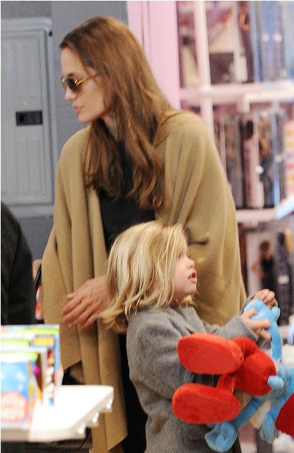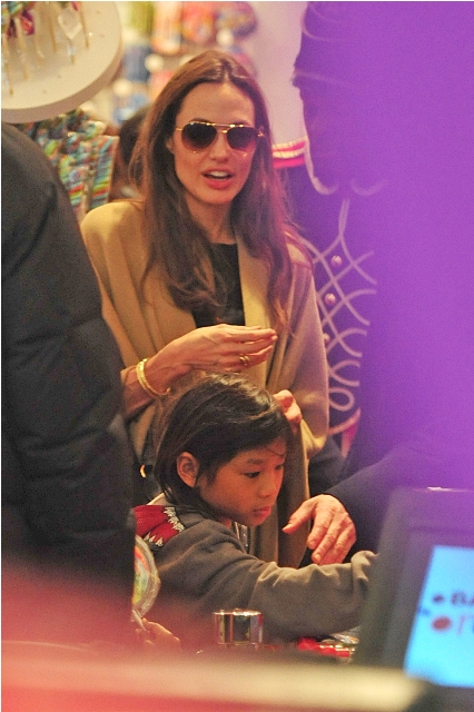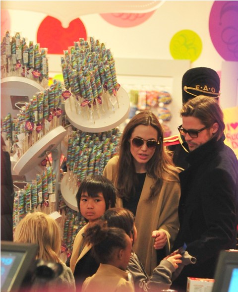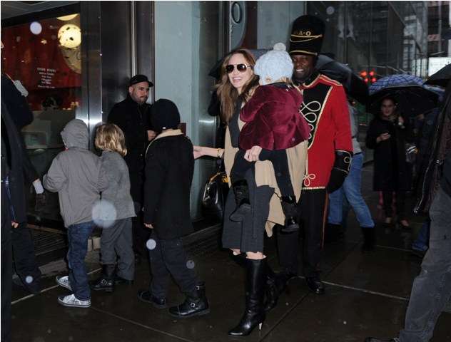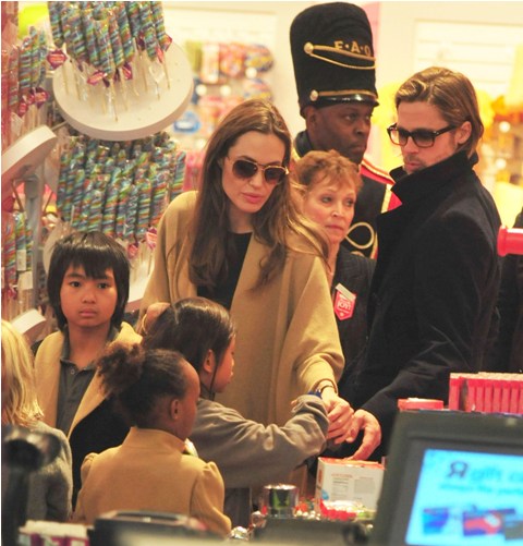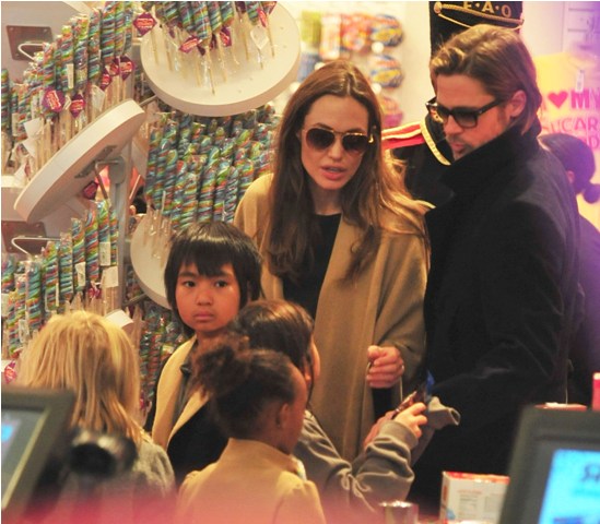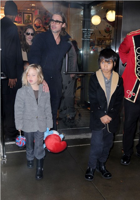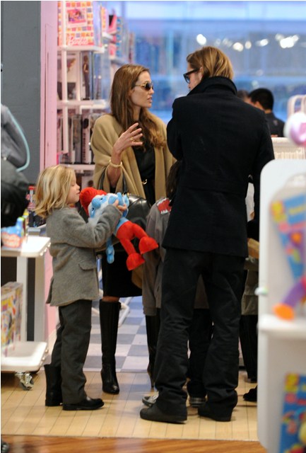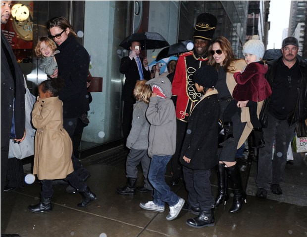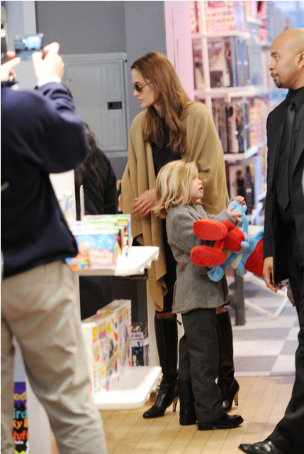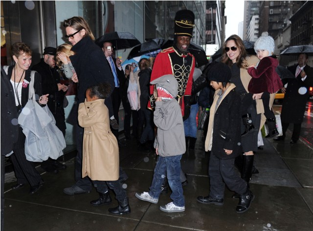 The Brange took all their kids to FAO Schwartz in New York yesterday. I always wonder the most random things when it comes to these two. Like...who pays? Does he pull out his credit card or does she do it? Or do they roll like William and Harry? With William and Harry, say when they hit up a club, either a bodyguard takes care of it discreetly or someone rings the next day with payment. Is there a Brange assistant/nanny who hangs back with the cash money? Do you care as much as I do?