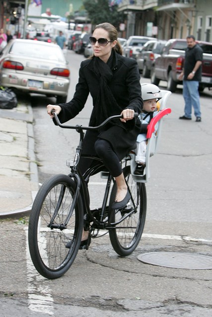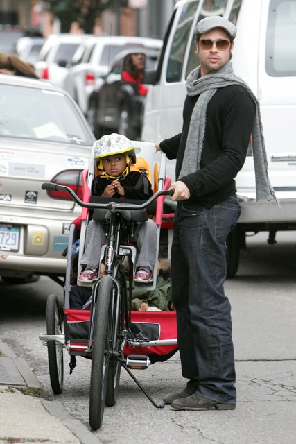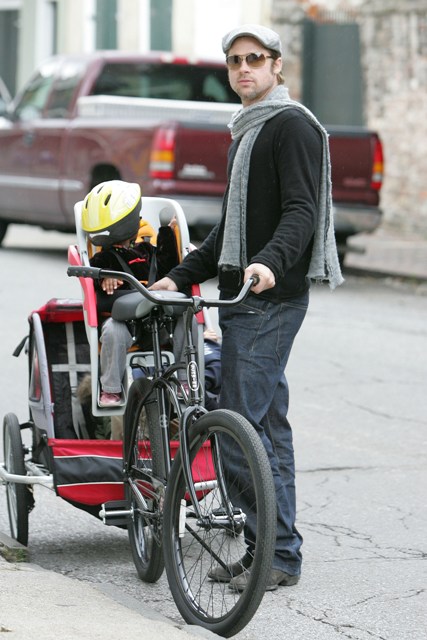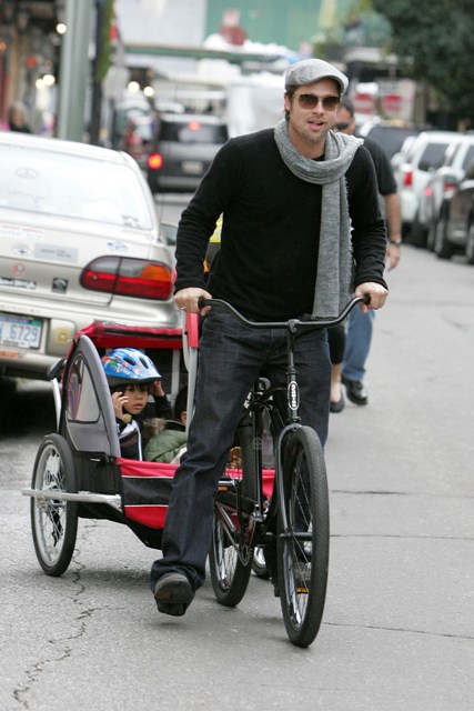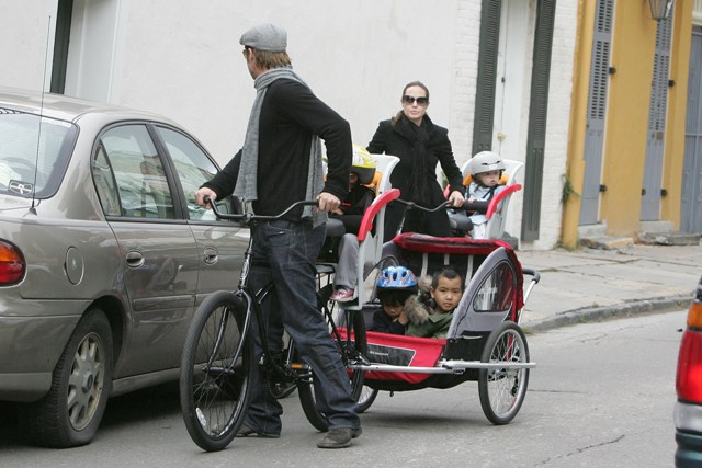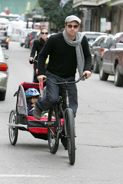The Family Pitt went on a family bike ride the other day in New Orleans with the kids, giving the the paps and the Brangelunatics a rare glimpse of the Chosen One strapped with mom as Miss Zahara, Maddox, and Pax load up with dad.