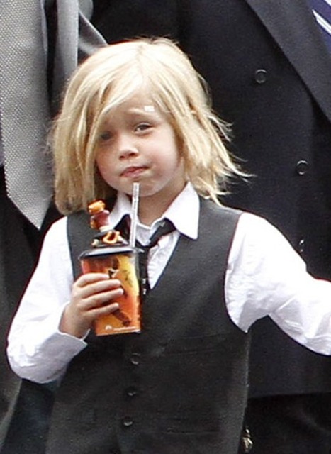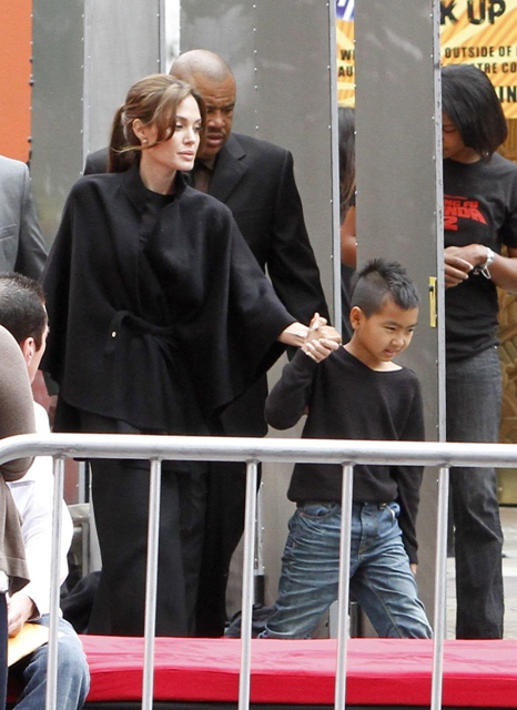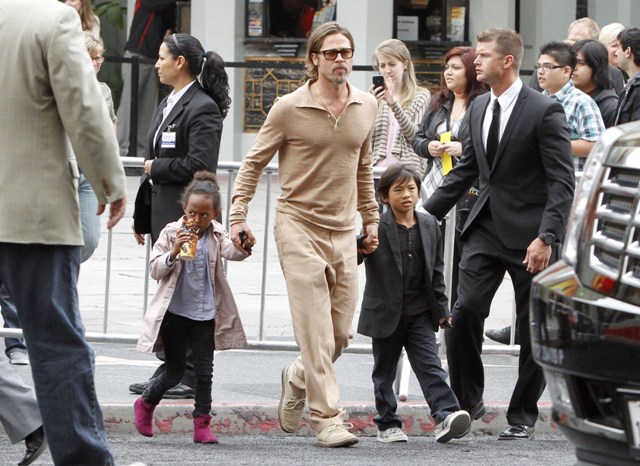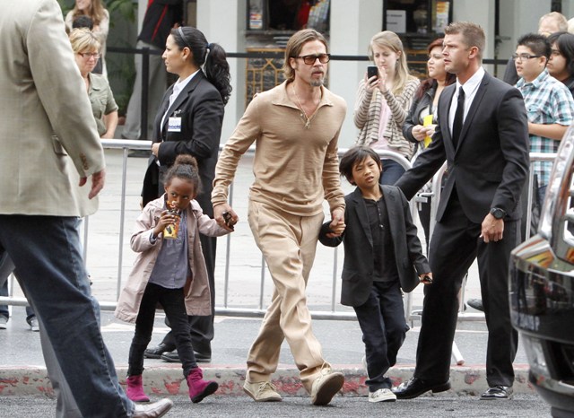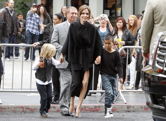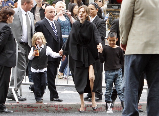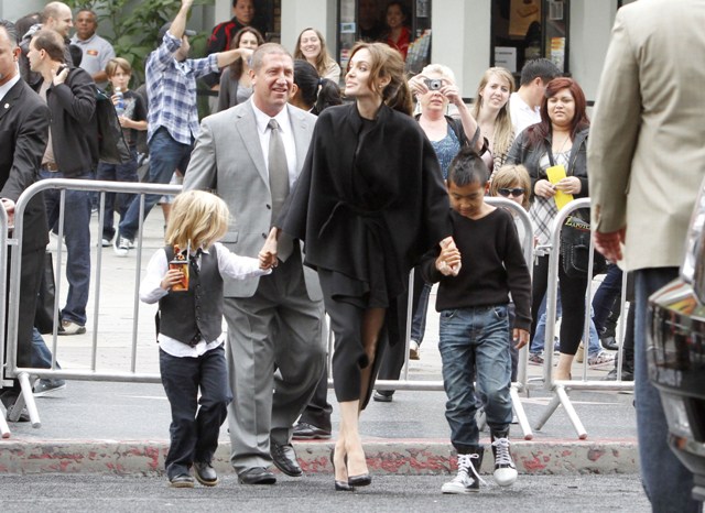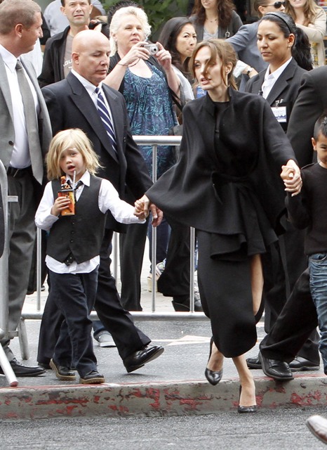 And of course, the children. They were there. At least 4 of them were. Angelina took hold of numbers 1 and 4, Brad had 2 and 3. These photos are from after the screening. No carpet walks for the kids yet. You think the Pitt kids will be like the Smith kids? Willow, Jaden, all of them on a press line all together? I actually don’t know my own answer to this. Please you tell me.