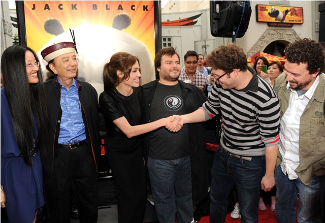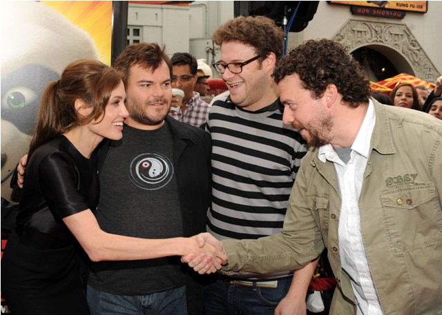 While The Tree of Life was being celebrated on Sunday in Cannes at the Palais, Brange was in LA selling something else. Kung Fu Panda 2. I’ve already told you how I feel about Brad’s hair right now – love it – but even I can’t get behind his clothes on this occasion. Like, wear jeans if you want to be casual, right? Also, I’m not sure the Jolie knows how to work that one bony leg in a slit. Looks awkward to me. I do however love the photo of her being introduced to Seth Rogen and Danny McBride. Cracks me up. I wonder what those two were thinking.