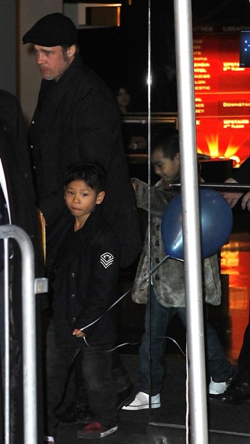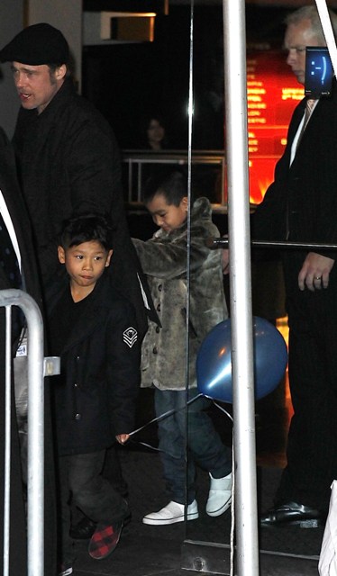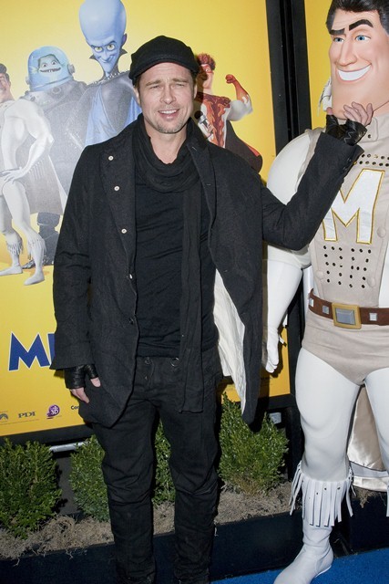 Brad Pitt was in New York last night with sons Maddox and Pax at the premiere of Megamind. Pitt of course voices the role of Metro Man in the movie. I quite enjoyed the movie actually. Screened it a couple of weeks ago at the junket in LA. It’s funny. At several points we were laughing heartily. I mean, it’s not the most original piece of filmmaking ever for all time, but it’s a good time for adults and for kids. Which is obviously why Pitt decided to bring along his boys. And also because that way it’s harder to make up stories about him cheating or sneaking away to visit Jennifer Aniston on the sly. With the holidays approaching though, and the tabloids eager for some extra juice, I’m sure this is what they’ll be serving for Thanksgiving. It’s almost a guarantee.