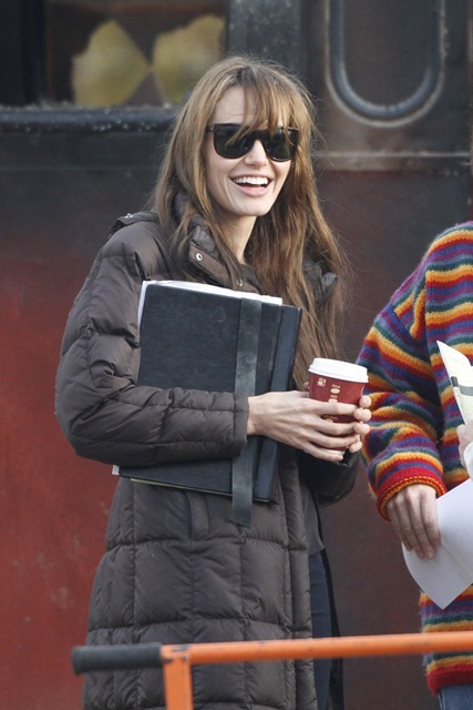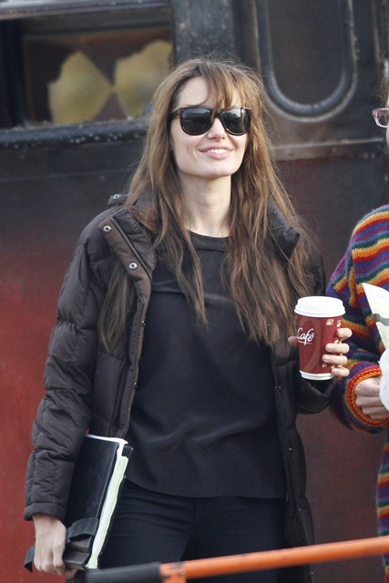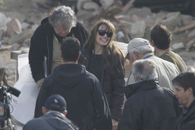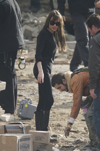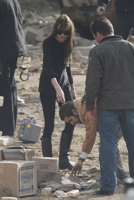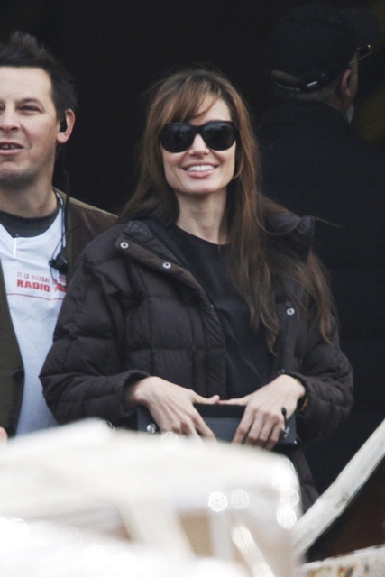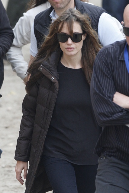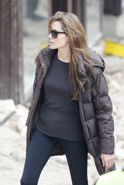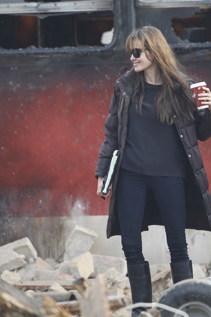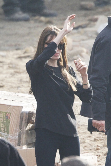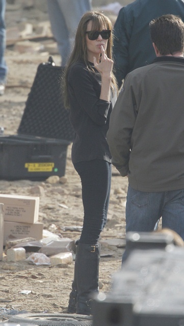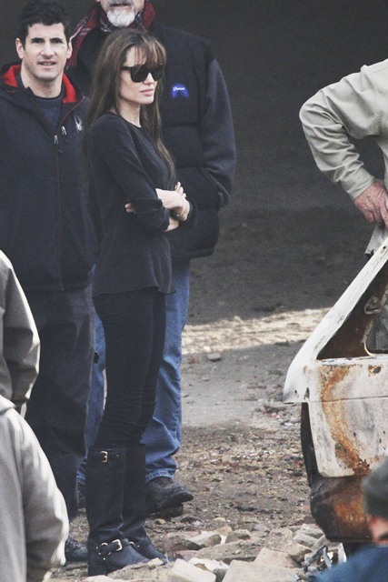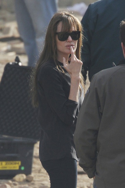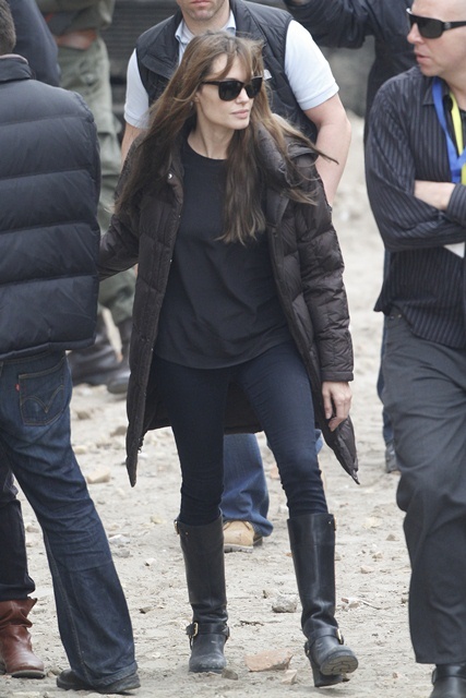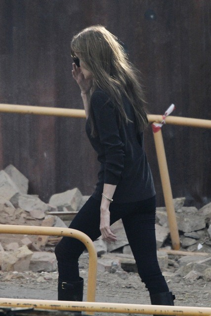 Anyway, Angelina the Director was shooting outside today and gave us a changeup in her wardrobe. Skinny jeans tucked into riding boots. It doesn’t happen often. As you know, the Jolie steeze isn’t terribly exciting. But unadorned, no makeup, without a stylist trailing behind her, and her hair all over the place, these are the times you appreciate That Face. It’s ridiculous.