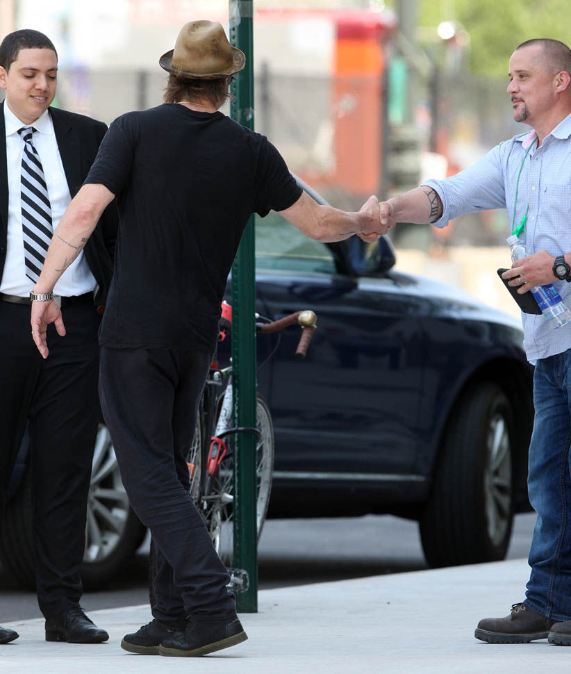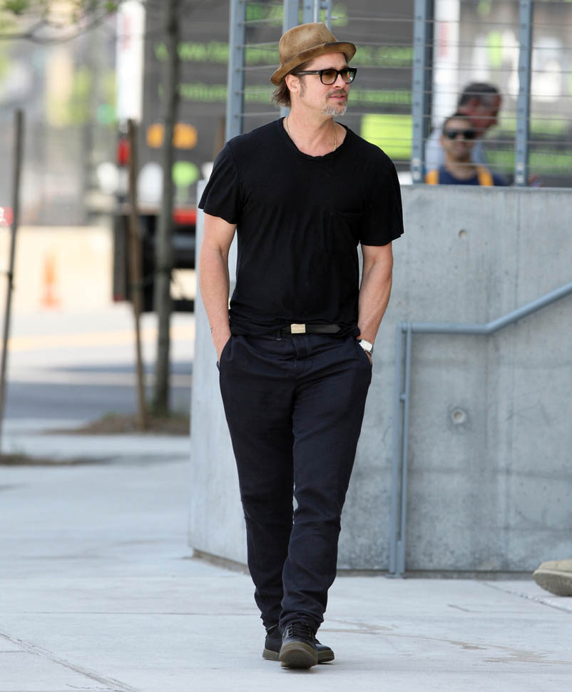 Brad Pitt was in New York for a couple of days, perhaps for art. Yesterday he was seen at the Whitney Museum. And at one point he agreed to take photos with some fans. Note how he kept his hands in his pockets instead of putting his arms around them? This, for some reason, cracks me up.
