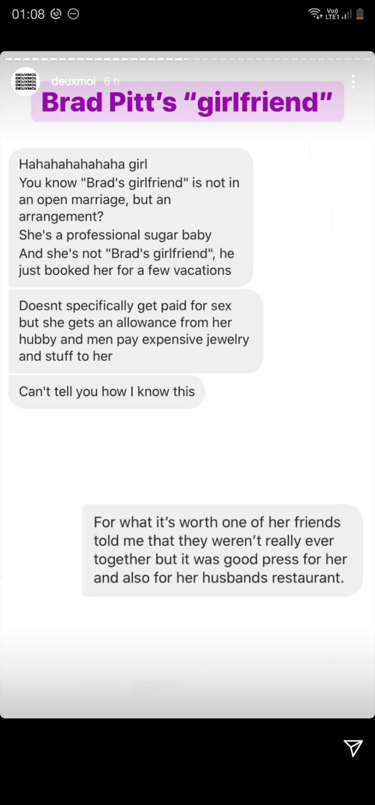 Maria’s been sharing some of Deux Moi’s content over the last few months but if you’re not familiar with Deux Moi, The Cut just posted an article about it. Deux Moi stresses that they have no way of verifying what people send them so this, again is a rumour, but everybody in Hollywood is paying attention to that account right now and again, it’s not the kind of story that Brad Pitt wants to be a part of. How he managed to get himself in this story is…well… kind of cliché, non? Even if this is bullsh-t, it’s not like we haven’t been told this kind of thing from time: older men, younger women, companionship.