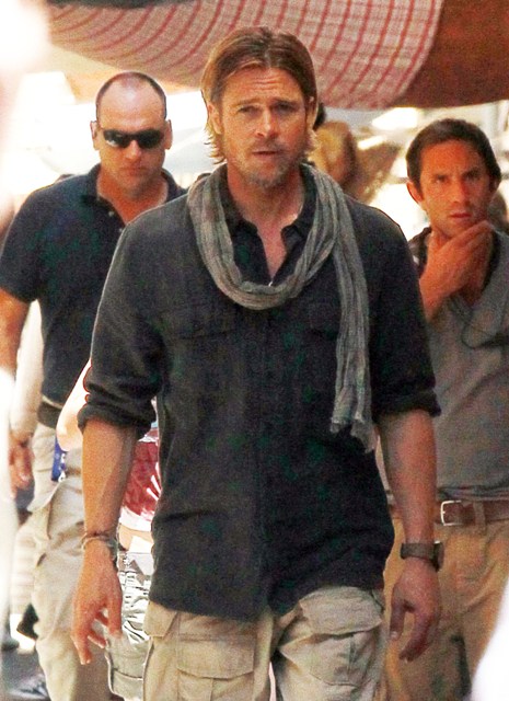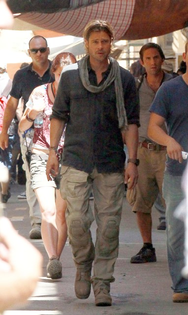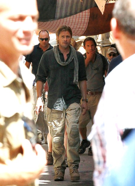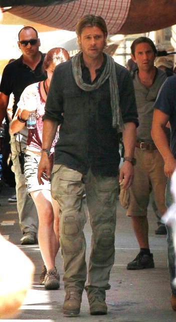 Here’s Brad yesterday continuing to film World War Z in cargo pants and a casual linen up top and, come on, like for real, you’re not all over this look, his look right now? It’s a perfect amount of ruggedness. He never, ever wears a pair of pants badly, and his gait... I know I say this all the time but you people keep fighting me on his steeze, his sexiness, and I need to keep at it – this man is the sh-t! Put aside your team this and team that biases... put it aside and consider it straight on. Hot. We are fighting on it. HOT.