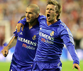 Brad Pitt is a classic but the Freebie 5 is about fantasy. And if I’m no longer fantasizing about Angie’s whipping boy – how can he stay on the list? Besides, as I said before, he’s lookin’ a lot rough around the edges these days - nothing a little tasteful, subtle Botox couldn’t take care of but something tells me he doesn’t do that anymore. And hey – it’s great that he appears to be eschewing the superficial, I definitely approve. The consequence of this new depth, however, is that he’s no longer worthy of inclusion. Which means there’s an opening. Say hello to Zizou. Every year, I go completely mad for an imaginary lover. Last time it was Joaquin Phoenix, before that it was Ryan Gosling – both whom have since been removed. This time, I’m confident I’ve found a lifer. Because for the last 3 weeks it’s been Zinedine Zidane all day, all the time, and watching his s0-called apology interview on French television last week while sick in bed didn’t help the obsession. Zidane is loin quivering explosive perfection. He is elegance on the pitch, fierce personality off the pitch, hot sweaty sex all the time – and, obvious, but you know he speaks French…right? As for what he did – no, no, I don’t condone it but I do condone how he handled it post-match. Sometimes it’s how a man deals with adversity that really rocks me the right way. I’m telling you gossips - YouTube the interview, observe his quiet class, accessorized by his skin and those eyes, and the way he looks in street clothes…and you will so totally get it. I promise. Zizou for the Freebie 5. Zizou toujours. Zizou & Becks? And how ‘bout that for a tagteam???