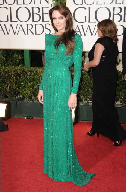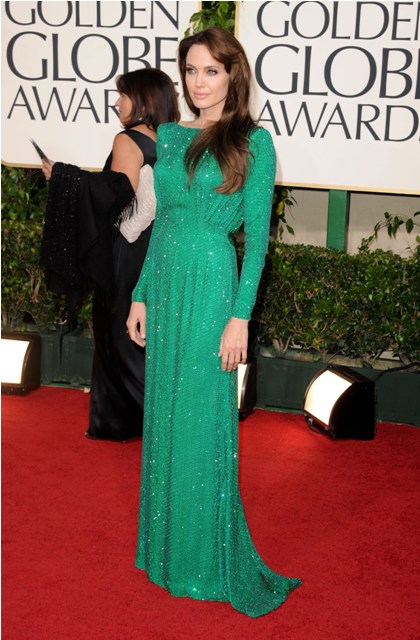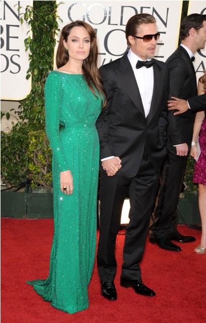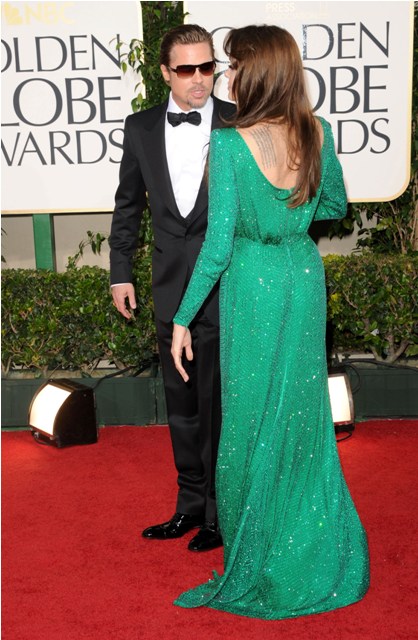 So it’s his fault. He’s to blame for the green Sister-Wife action she had on at the Golden Globes. You remember it, don’t you? Let’s revisit, just in case you forgot about the time Jolie the Settler looked like she was down with polygamy at the Beverly Hilton.