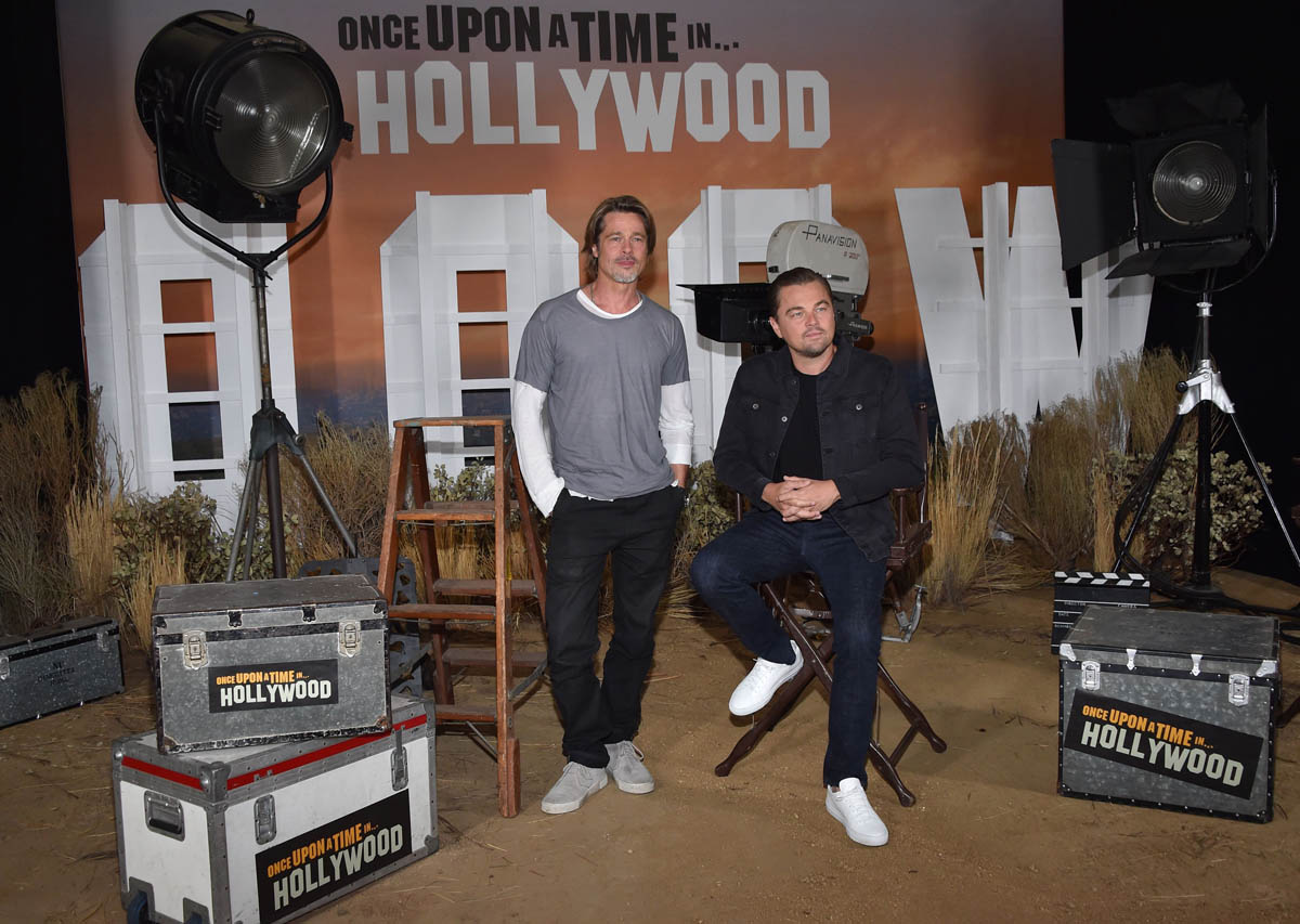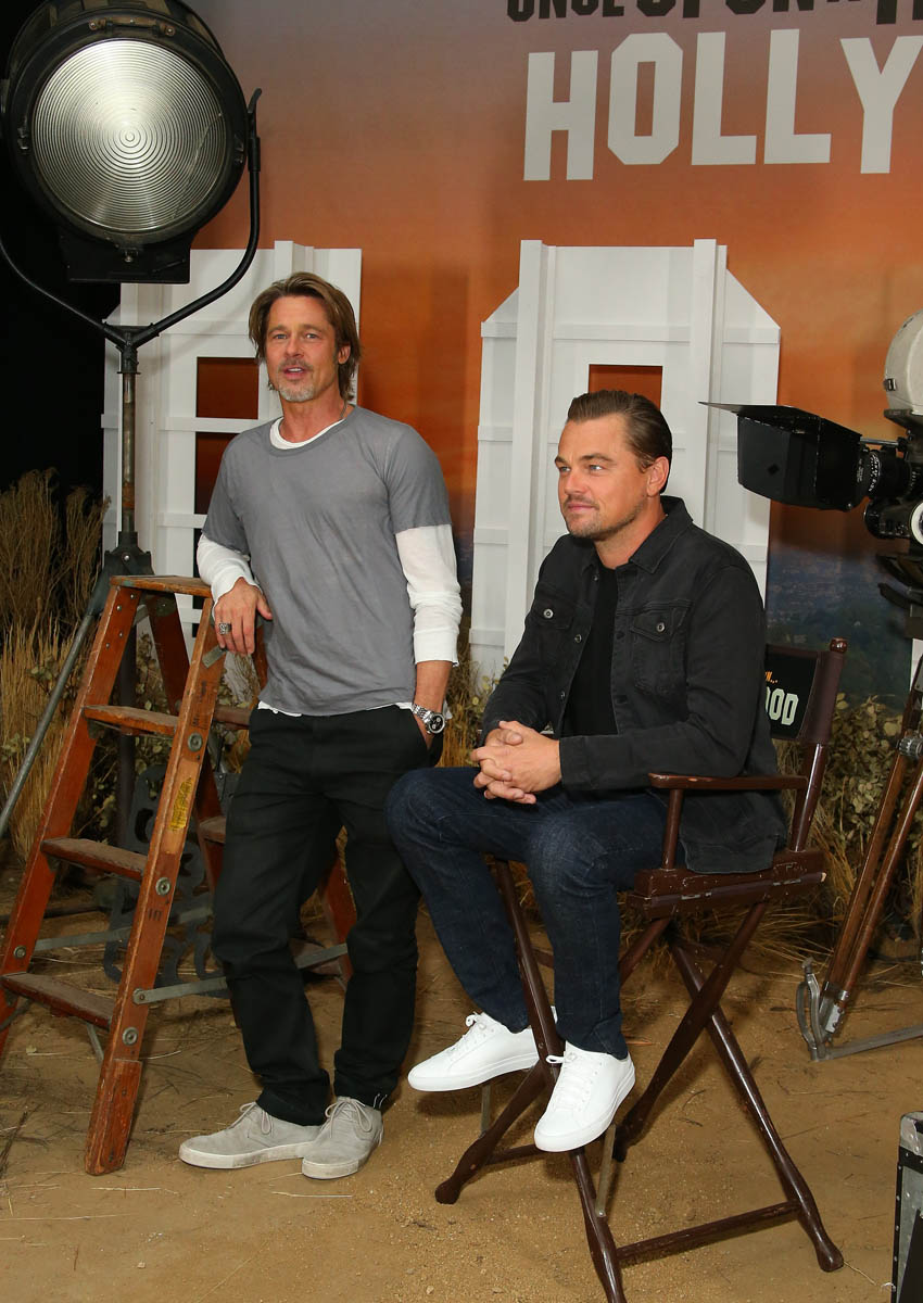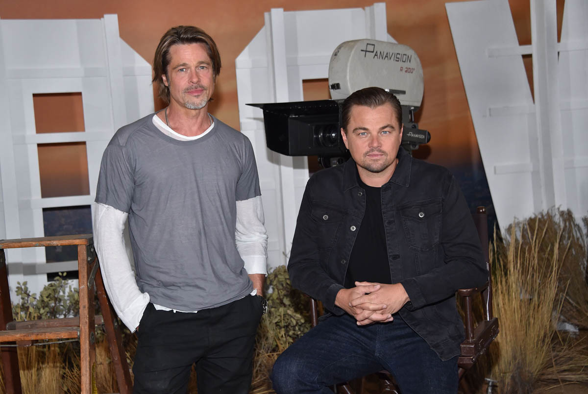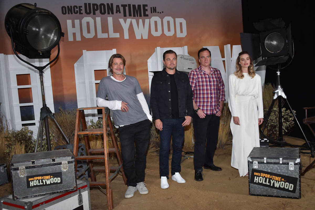 With two weeks to go, then, the final promotional push begins. Here are QT, Margot Robbie, Brad Pitt, and Leonardo DiCaprio yesterday for a photo call and Q&A in LA. Brad, as you can see, is wearing what seems to be his 2019 uniform: grey tee over a long-sleeved white tee, over utility pants, and sneakers. No cap though. Good decision. Because his hair is really, really good right now. His parents really did him a solid with the hair thing with those hair genes. Would he have been able to maintain his allure if there had been hair changes?
